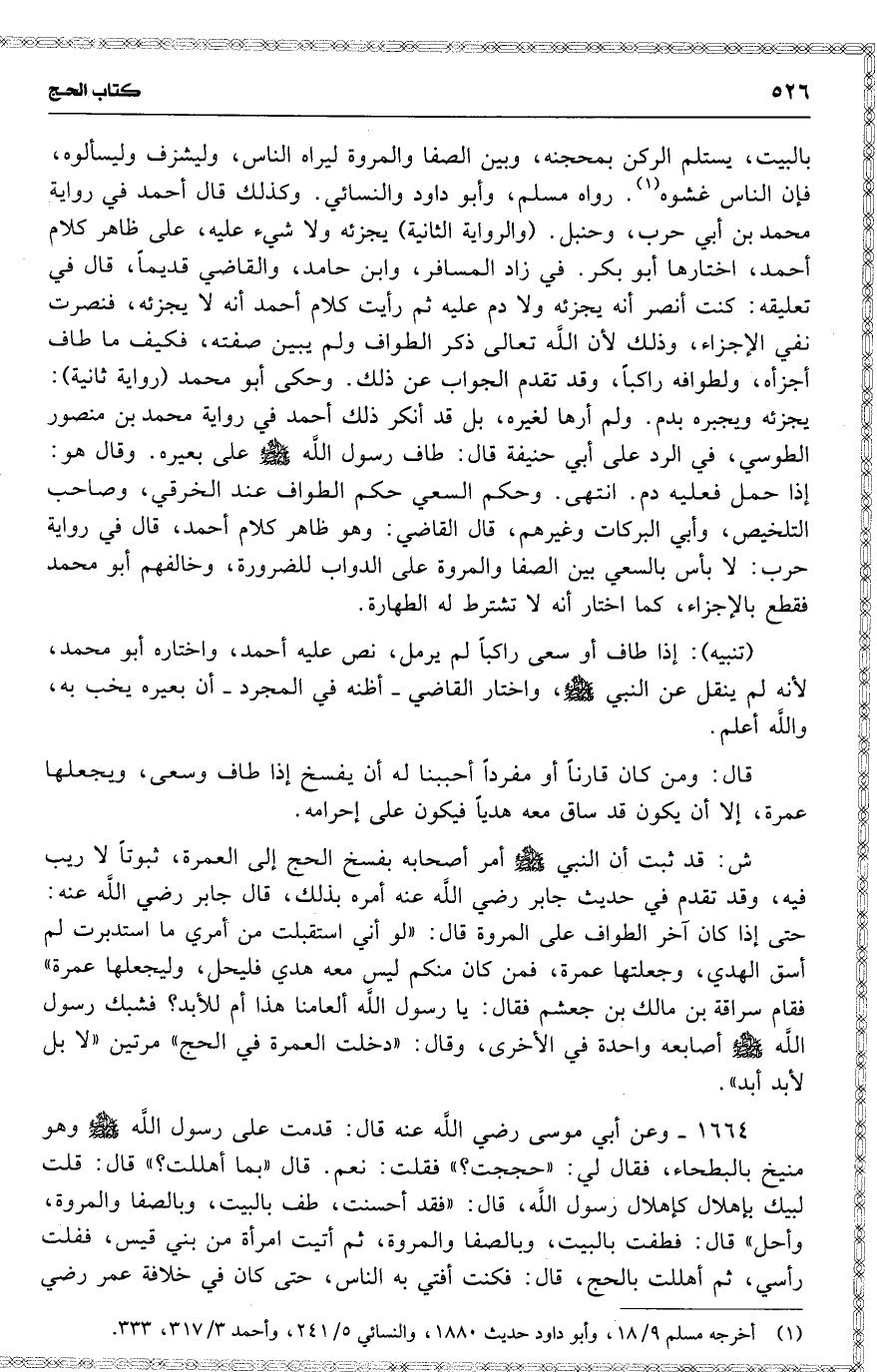 بالبيت ، يستلم الركن بمحجنه ، وبين الصفا والمروة ليراه الناس ، وليشرف وليسألوه ، فإن الناس غشوه . رواه مسلم ، وأبو داود والنسائي . وكذلك قال أحمد في رواية محمد بن أبي حرب ، وحنبل . ( والرواية الثانية ) يجزئه ولا شيء عليه ، على ظاهر كلام أحمد ، اختارها أبو بكر . في زاد المسافر ، وابن حامد ، والقاضي قديماً ، قال في تعليقه : كنت أنصر أنه يجزئه [ ولا دم عليه ] ثم رأيت كلام أحمد أنه لا يجزئه ، فنصرت نفي الإجزاء ، وذلك لأن اللَّه تعالى ذكر الطواف ولم يبين صفته ، فكيف ما طاف أجزأه ، ولطوافه راكباً ، وقد تقدم الجواب عن ذلك . وحكى أبو محمد ( رواية ثانية ) : يجزئه ويجبره بدم . ولم أرها لغيره ، بل قد أنكر ذلك أحمد في رواية محمد بن منصور الطوسي ، في الرد على أبي حنيفة قال : طاف رسول اللَّه على بعيره . وقال هو : إذا حمل فعليه دم . انتهى . وحكم السعي حكم الطواف عند الخرقي ، وصاحب التلخيص ، وأبي البركات وغيرهم ، قال القاضي : وهو ظاهر كلام أحمد ، قال في رواية حرب : لا بأس بالسعي بين الصفا والمروة على الدواب للضرورة ، وخالفهم أبو محمد فقطع بالإجزاء ، كما اختار أنه لا تشترط له الطهارة .