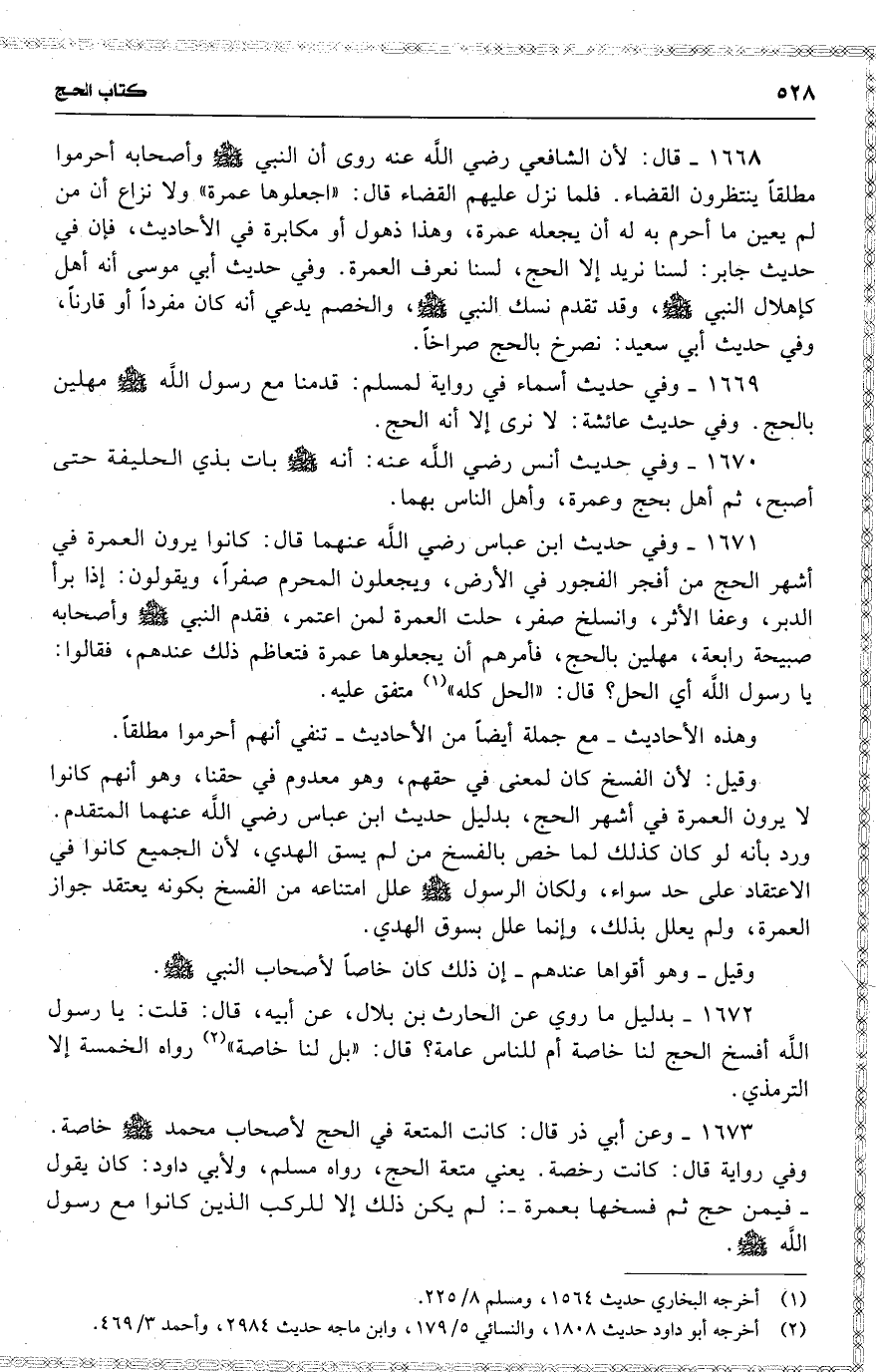 1668 قال : لأن الشافعي رضي اللَّه عنه روى أن النبي وأصحابه أحرموا مطلقاً ينتظرون القضاء . فلما نزل عليهم القضاء قال : ( اجعلوها عمرة ) ولا نزاع أن من لم يعين ما أحرم به له أن يجعله عمرة ، وهذا ذهول أو مكابرة في الأحاديث ، فإن في حديث جابر : لسنا نريد إلا الحج ، لسنا نعرف العمرة . وفي حديث أبي موسى أنه أهل كإهلال النبي ، وقد تقدم نسك النبي ، والخصم يدعي أنه كان مفرداً أو قارناً ، وفي حديث أبي سعيد : نصرخ بالحج صراخاً .