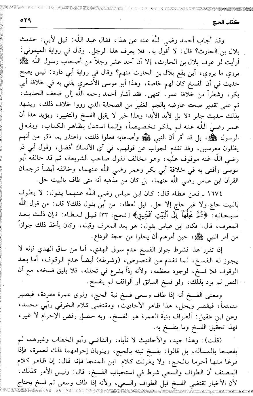 وقد أجاب أحمد رضي اللَّه عنه عن هذا ، فقال عبد اللَّه : قيل لأبي : حديث بلال بن الحارث ؟ قال : لا أقول به ، فلا يعرف هذا الرجل . وقال في رواية الميموني : أرأيت لو عرف بلال بن الحارث ، إلا أن أحد عشر رجلاً من أصحاب رسول اللَّه يروي ما يروي ، أين يقع بلال بن الحارث منهم ؟ وقال في رواية أبي داود : ليس يصح حديث في أن الفسخ كان لهم خاصة ، وهذا أبو موسى الأشعري يفتي به في خلافة أبي بكر ، وشطراً من خلافة عمر . انتهى . فقد أشار أحمد رحمه اللَّه إلى ضعف الحديث ، ثم على تقدير صحته عارضه بالجم الغفير من الصحابة الذي رووا خلاف ذلك ، ويشهد بذلك حديث جابر ( لا بل لأبد الأبد ) وهذا خبر لا يقبل الفسخ والتغيير ، ويؤيد هذا أن عمر رضي اللَّه عنه لم يذكر تخصيصاً ، وإنما استدل بظاهر الكتاب ، وبفعل الرسول ، بل قد أقر أن النبي وأصحابه فعلوا ذلك ، واعتذر بما ذكر من أنهم يظلون معرسين ، وقد تقدم الجواب عن قولهم ، في أي الأنساك أفضل ، وقول أبي ذر رضي اللَّه عنه موقوف عليه ، وهو مخالف لقول صاحب الشريعة ، ثم قد خالفه أبو موسى وأفتى به في خلافة أبي بكر وعمر رضي اللَّه عنهما ، وخالفه أيضاً ترجمان القرآن ابن عباس رضي اللَّه عنهما ، بل كان من مذهبه أنه متى طاف بالبيت حل .