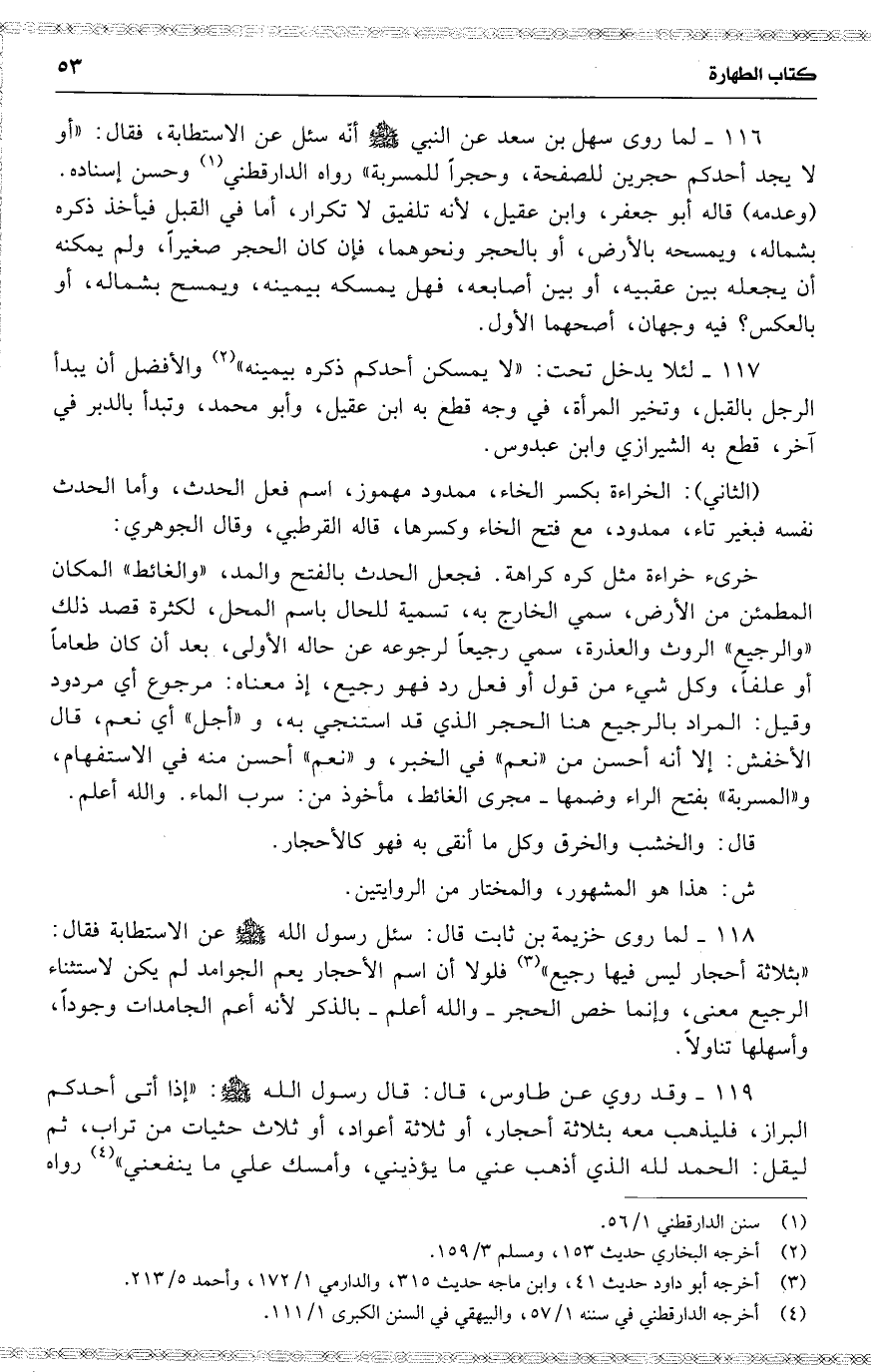 116 لما روى سهل بن سعد عن النبي أنّه سئل عن الاستطابة ، فقال : ( أو لا يجد أحدكم حجرين للصفحة ، وحجراً للمسربة ) رواه الدارقطني وحسن إسناده . ( وعدمه ) قاله أبو جعفر ، وابن عقيل ، لأنه تلفيق لا تكرار ، أما في القبل فيأخذ ذكره بشماله ، ويمسحه بالأرض ، أو بالحجر ونحوهما ، فإن كان الحجر صغيراً ، ولم يمكنه أن يجعله بين عقبيه ، أو بين أصابعه ، فهل يمسكه بيمينه ، ويمسح بشماله ، أو بالعكس ؟ فيه وجهان ، أصحهما الأول .