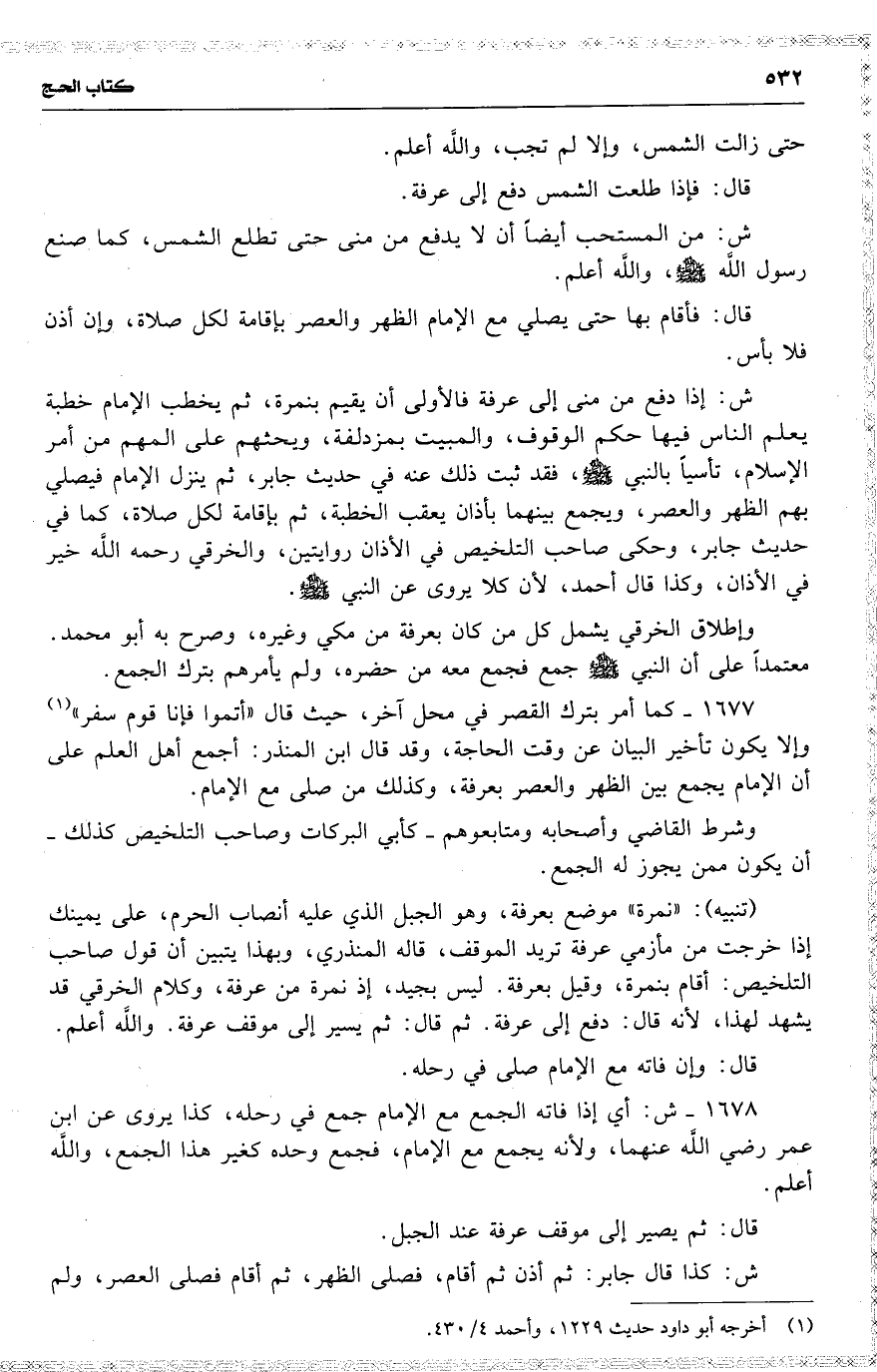 ش : إذا دفع من منى إلى عرفة فالأولى أن يقيم بنمرة ، ثم يخطب الإمام خطبة يعلم الناس فيها حكم الوقوف ، والمبيت بمزدلفة ، ويحثهم على المهم من أمر الإسلام ، تأسياً بالنبي ، فقد ثبت ذلك عنه في حديث جابر ، ثم ينزل الإمام فيصلي بهم الظهر والعصر ، ويجمع بينهما بأذان يعقب الخطبة ، ثم بإقامة لكل صلاة ، كما في حديث جابر ، وحكى صاحب التلخيص في الأذان روايتين ، والخرقي رحمه اللَّه خير في الأذان ، وكذا قال أحمد ، لأن كلا يروى عن النبي .