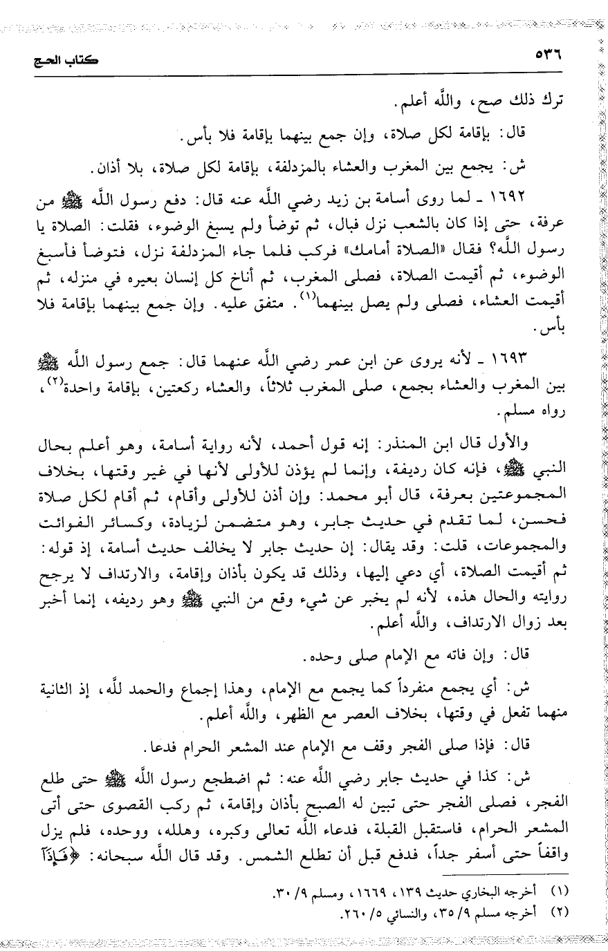1692 لما روى أسامة بن زيد رضي اللَّه عنه قال : دفع رسول اللَّه من عرفة ، حتى إذا كان بالشعب نزل فبال ، ثم توضأ ولم يسبغ الوضوء ، فقلت : الصلاة يا رسول اللَّه ؟ فقال ( الصلاة أمامك ) فركب فلما جاء المزدلفة نزل ، فتوضأ فأسبغ الوضوء ، د ثم أقيمت الصلاة ، فصلى المغرب ، ثم أناخ كل إنسان بعيره في منزله ، ثم أقيمت العشاء ، فصلى ولم يصل بينهما . متفق عليه . وإن جمع بينهما بإقامة فلا بأس .