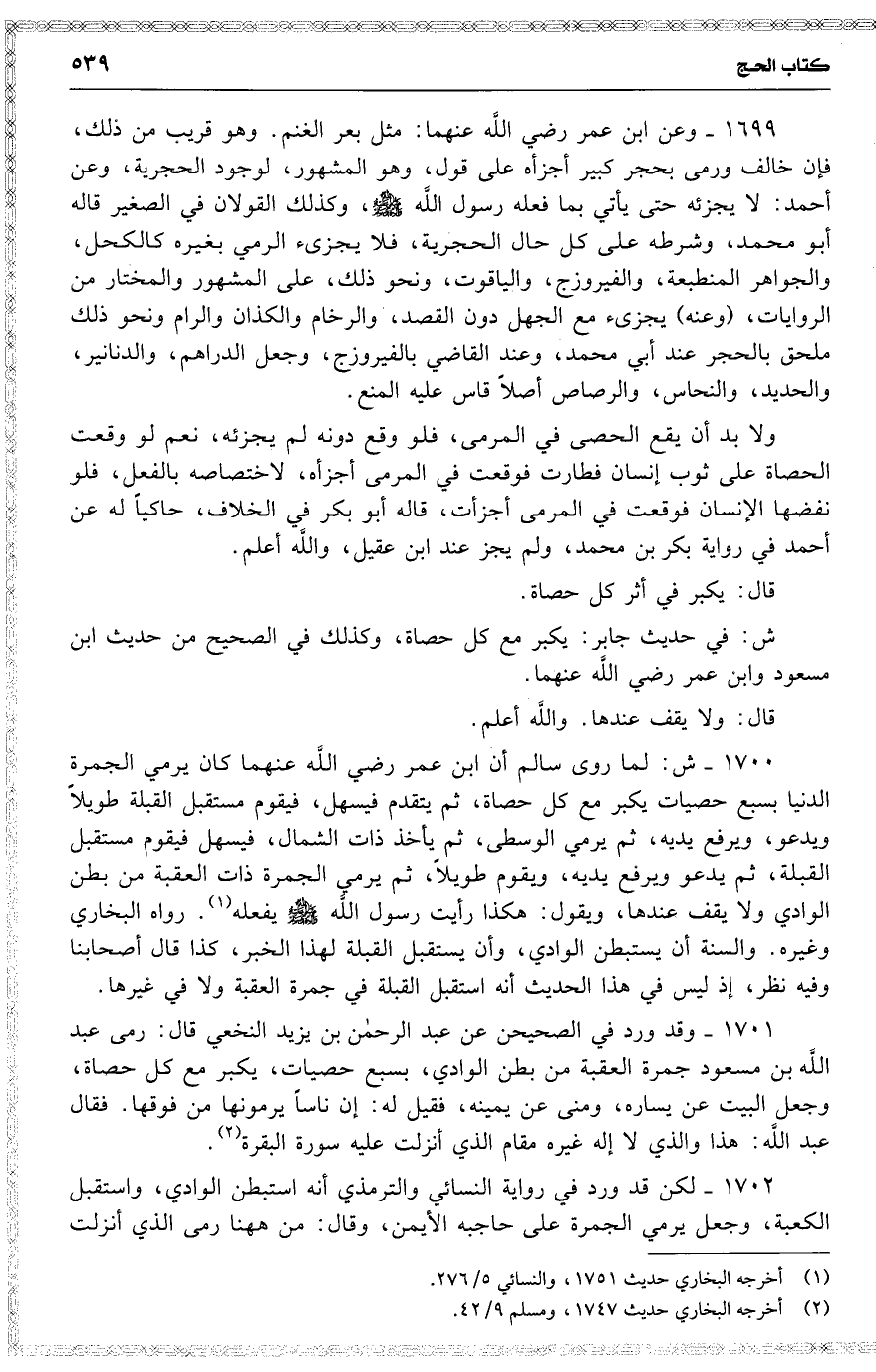 1701 وقد ورد في الصحيحن عن عبد الرحمن بن يزيد النخعي قال : رمى عبد اللَّه بن مسعود جمرة العقبة من بطن الوادي ، بسبع حصيات ، يكبر مع كل حصاة ، وجعل البيت عن يساره ، ومنى عن يمينه ، فقيل له : إن ناساً يرمونها من فوقها . فقال عبد اللَّه : هذا والذي لا إله غيره مقام الذي أنزلت