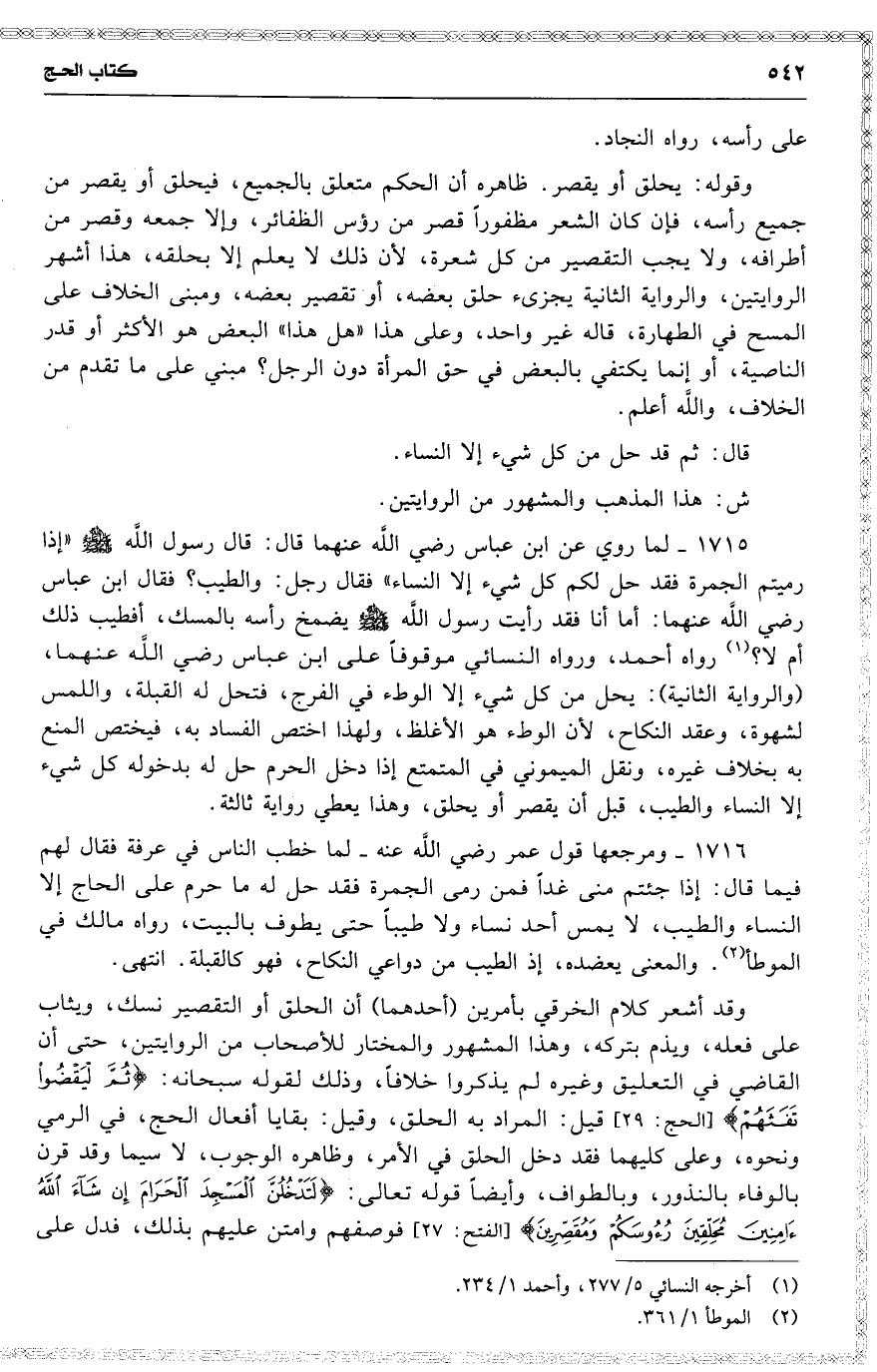 1715 لما روي عن ابن عباس رضي اللَّه عنهما قال : قال رسول اللَّه ( إذا رميتم الجمرة فقد حل لكم كل شيء إلا النساء ) فقال رجل : والطيب ؟ فقال ابن عباس رضي اللَّه عنهما : أما أنا فقد رأيت رسول اللَّه يضمخ رأسه بالمسك ، أفطيب ذلك أم لا ؟ رواه أحمد ، ورواه النسائي موقوفاً على ابن عباس رضي اللَّه عنهما ، ( والرواية الثانية ) : يحل من كل شيء إلا الوطء في الفرج ، فتحل له القبلة ، واللمس لشهوة ، وعقد النكاح ، لأن الوطء هو الأغلظ ، ولهذا اختص الفساد به ، [ فيختص المنع به ] بخلاف غيره ، ونقل الميموني في المتمتع إذا دخل الحرم حل له بدخوله كل شيء إلا النساء والطيب ، قبل أن يقصر أو يحلق ، وهذا يعطي رواية ثالثة .