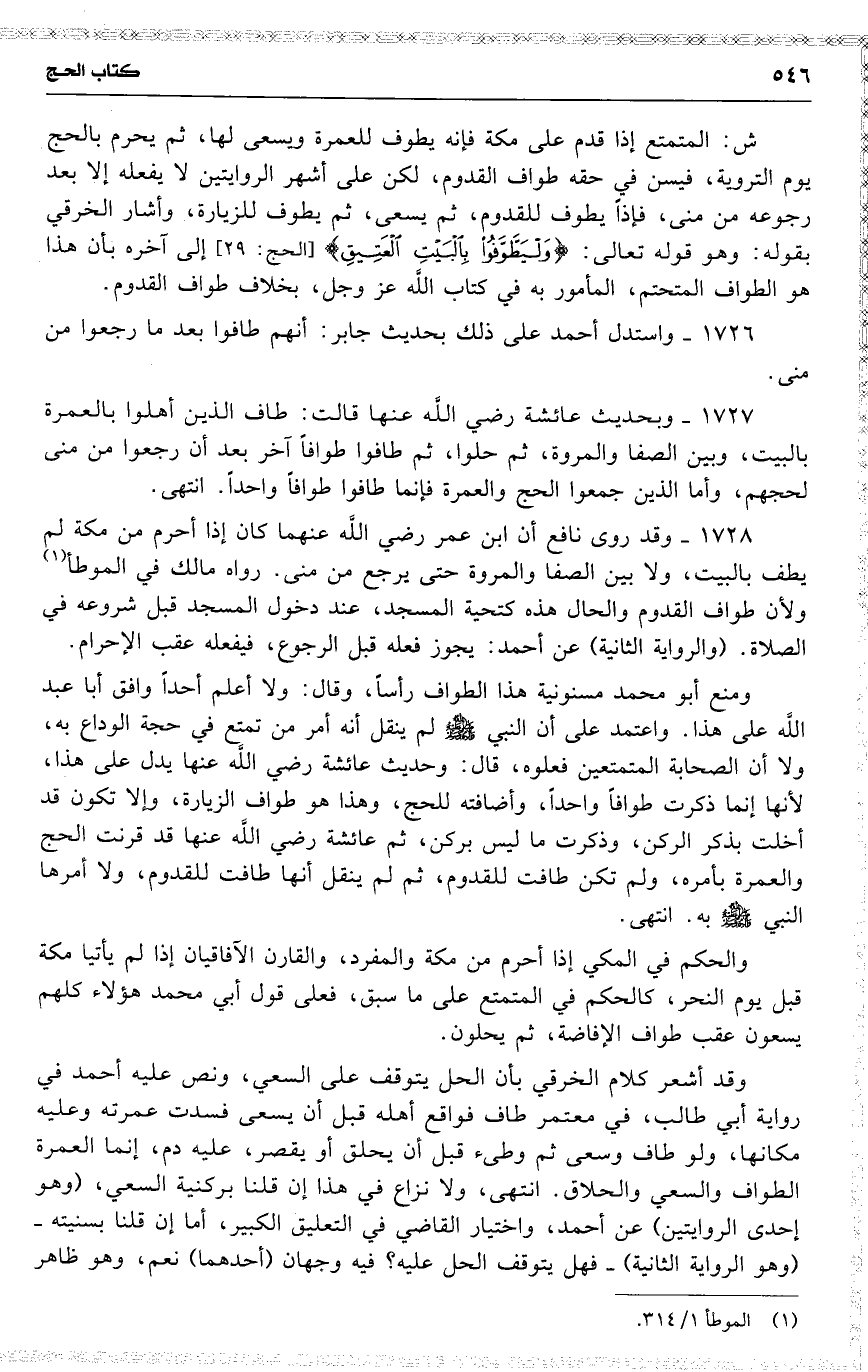 ومنع أبو محمد مسنونية هذا الطواف رأساً ، ) 16 ( وقال : ولا أعلم أحداً وافق أبا عبد اللَّه على هذا . واعتمد على أن النبي لم ينقل أنه أمر من تمتع في حجة الوداع به ، ولا أن الصحابة المتمتعين فعلوه ، قال : وحديث عائشة رضي اللَّه عنها يدل على هذا ، لأنها إنما ذكرت طوافاً واحداً ، وأضافته للحج ، وهذا هو طواف الزيارة ، وإلا تكون قد أخلت بذكر الركن ، وذكرت ما ليس بركن ، ثم عائشة رضي اللَّه عنها قد قرنت الحج والعمرة بأمره ، ولم تكن طافت للقدوم ، ثم لم ينقل أنها طافت للقدوم ، ولا أمرها النبي به . انتهى .