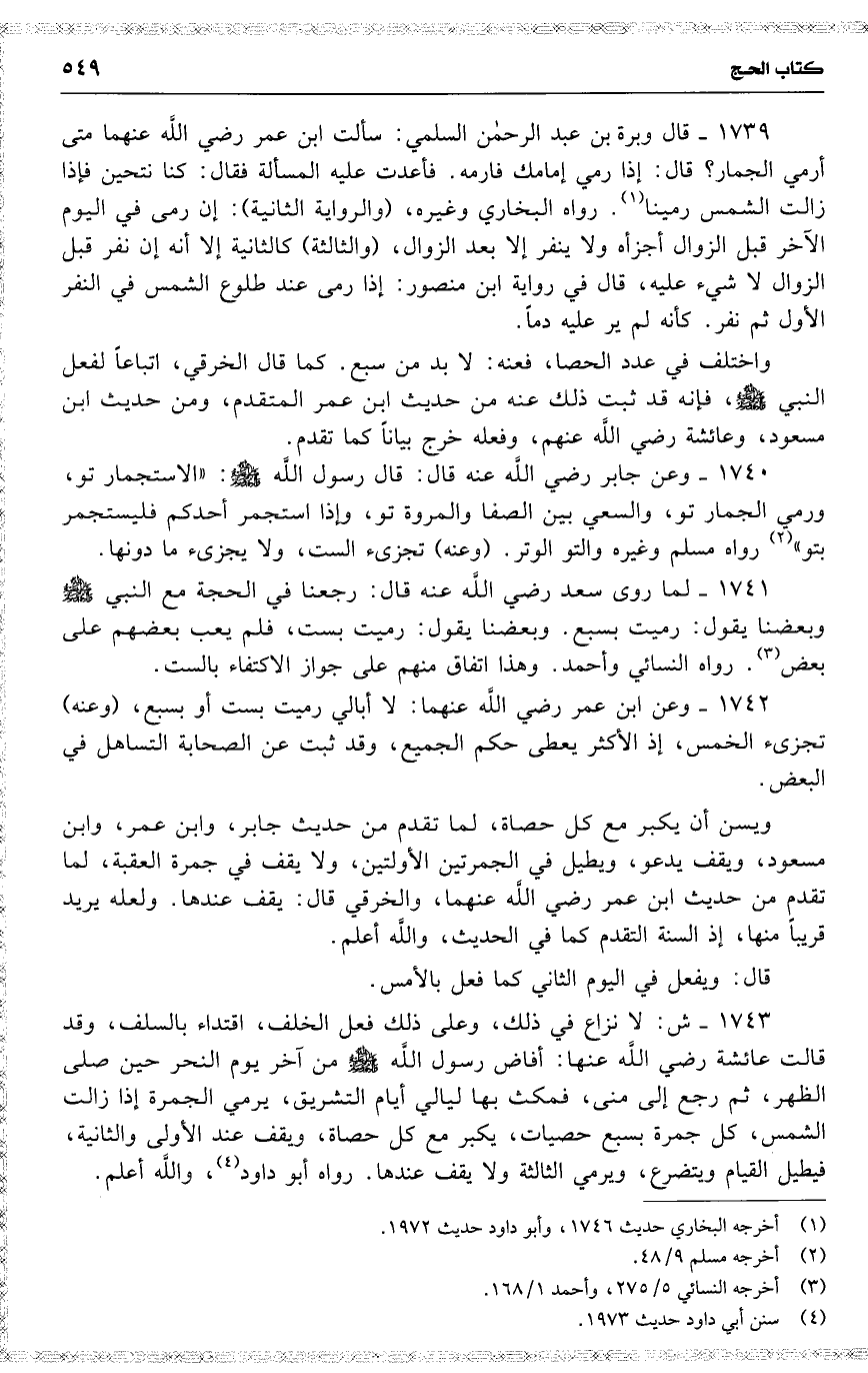 1741 لما روى سعد رضي اللَّه عنه قال : رجعنا في الحجة مع النبي وبعضنا يقول : رميت بسبع . وبعضنا يقول : رميت بست ، فلم يعب بعضهم على بعض . رواه النسائي وأحمد . وهذا اتفاق منهم على جواز الاكتفاء بالست .