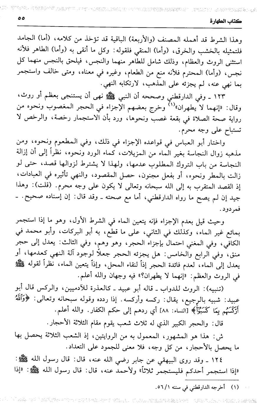 123 وفي الدارقطني وصححه أن النبي نهى أن يستنجى بعظم أو روث ، وقال : ( إنهما لا يطهران ) وخرج بعضهم الإجزاء في الحجر المغصوب ونحوه من رواية صحة الصلاة في بقعة غصب ونحوها ، ورد بأن الاستجمار رخصة ، والرخص لا تستباح على وجه محرم .