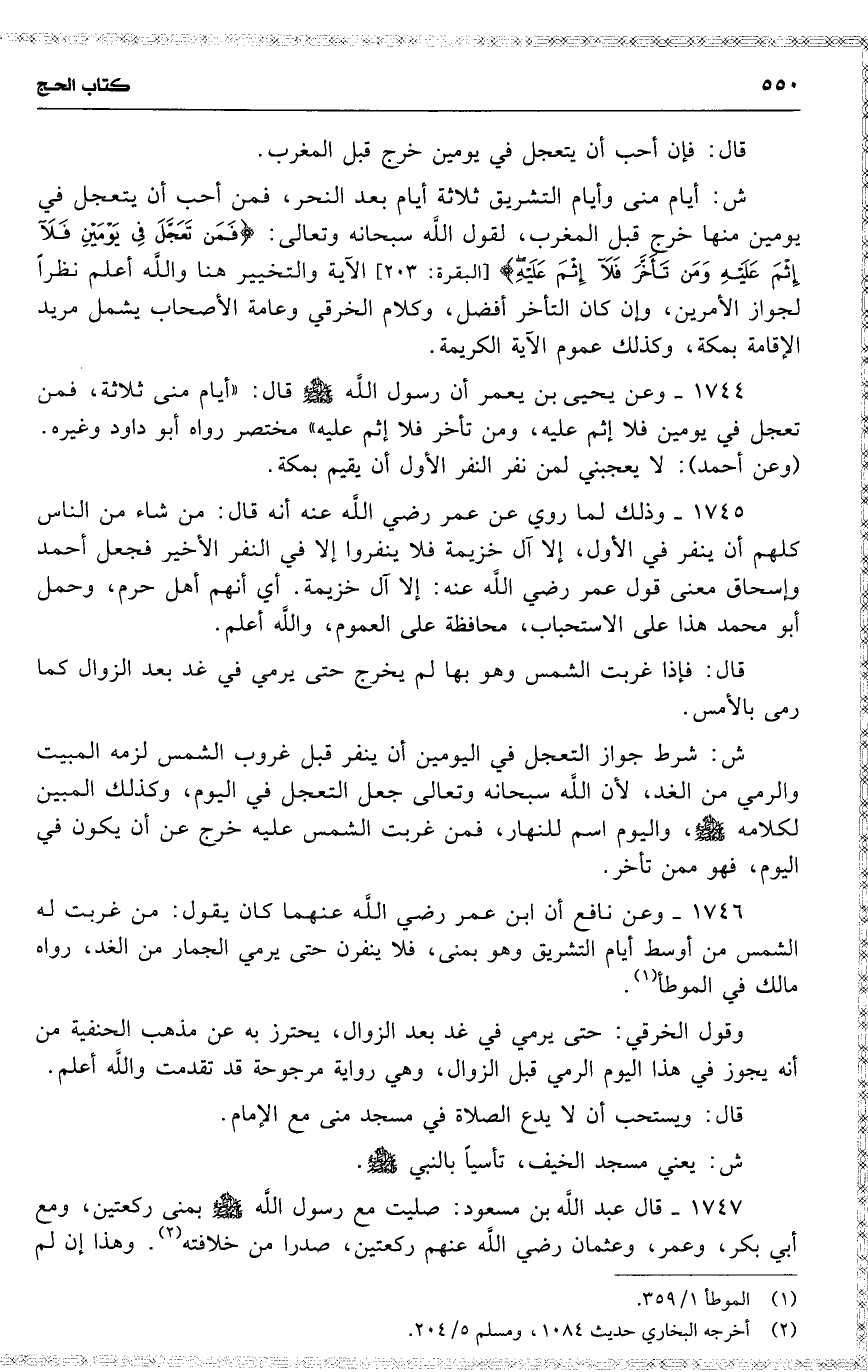 1746 وعن نافع أن ابن عمر رضي اللَّه عنهما كان يقول : 16 ( من غربت له الشمس من أوسط أيام التشريق وهو بمنى ، فلا ينفرن حتى يرمي الجمار من الغد ) ، رواه مالك في الموطأ .