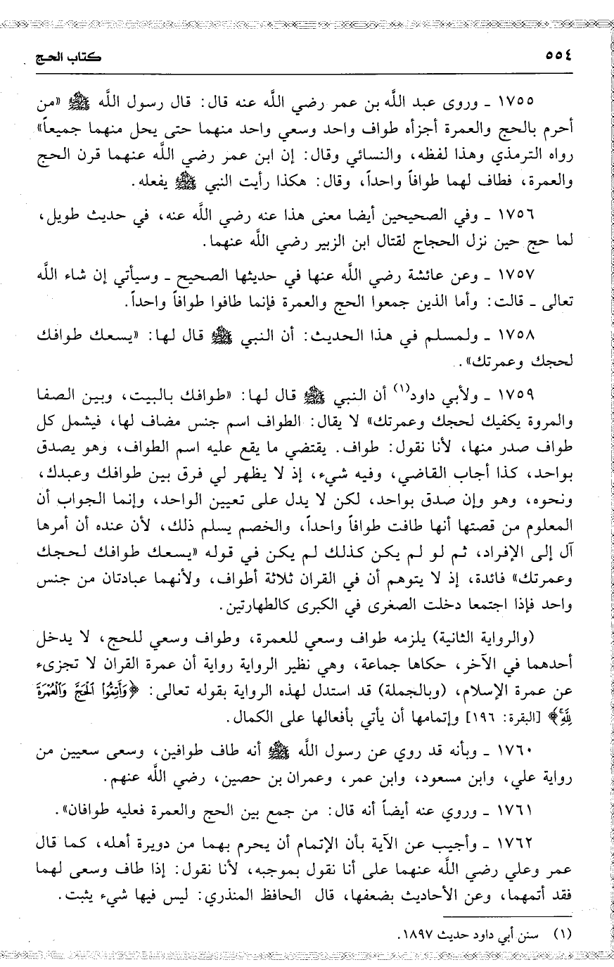 1755 وروى عبد اللَّه بن عمر رضي اللَّه عنه قال : قال رسول اللَّه ( من أحرم بالحج والعمرة أجزأه طواف واحد وسعي واحد منهما حتى يحل منهما جميعاً ) رواه الترمذي وهذا لفظه ، والنسائي وقال : إن ابن عمر رضي اللَّه عنهما قرن الحج والعمرة ، فطاف لهما طوافاً واحداً ، وقال : هكذا رأيت النبي يفعله .