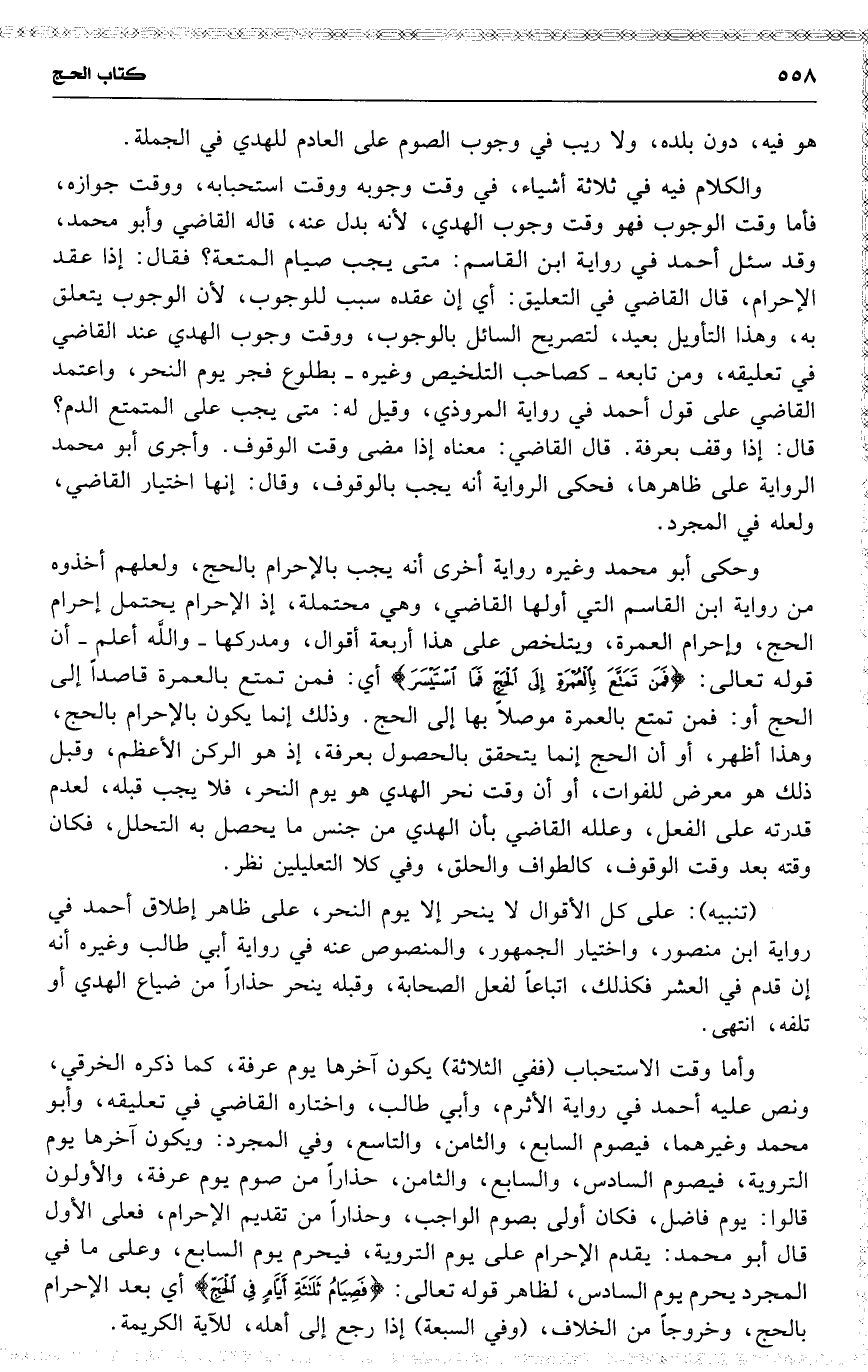 ( تنبيه ) : على كل الأقوال لا ينحر إلا يوم النحر ، على ظاهر إطلاق أحمد في رواية ابن منصور ، واختيار الجمهور ، والمنصوص عنه في رواية أبي طالب وغيره أنه إن قدم [ في ] العشر فكذلك ، اتباعاً لفعل الصحابة ، وقبله ينحر حذاراً من ضياع الهدي أو تلفه ، انتهى .