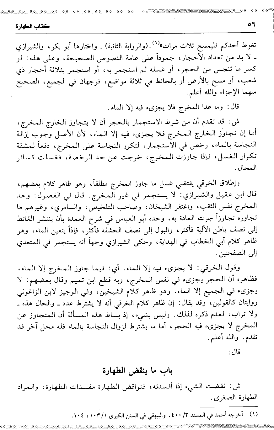 وقول الخرقي : لا يجزىء فيه إلا الماء . أي : فيما جاوز المخرج إلا الماء ، فظاهره أن الحجر يجزىء في نفس المخرج ، وبه قطع ابن تميم وقال بعضهم : لا يجزىء في الجميع إلا الماء . وهو ظاهر كلام الشيخين ، وفي الوجيز لابن الزاغوني روايتان كالقولين ، وقد يقال : إن ظاهر كلام الخرقي أنه لا يشترط عدد والحال هذه ولا تراب ، لعدم ذكره لذلك . وليس بشيء ، إذ بساط هذه المسألة أن المتجاوز عن المخرج لا يجزىء فيه الحجر ، أما ما يشترط لزوال النجاسة بالماء فله محل آخر قد تقدم . والله أعلم .