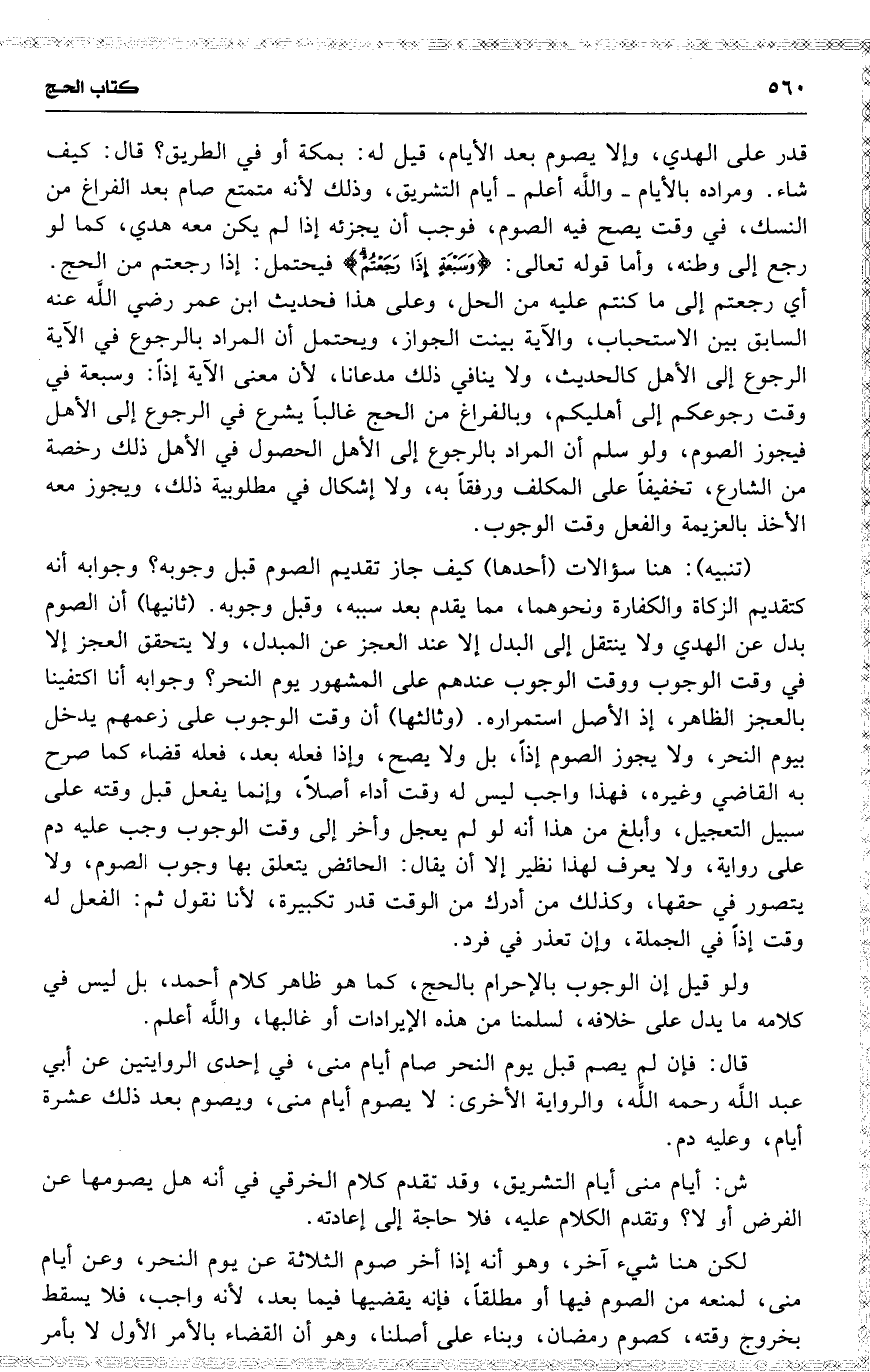 قدر على الهدي ، وألا يصوم بعد الأيام ، قيل له : بمكة أو في الطريق ؟ قال : كيف شاء . ومراده باويام واللَّه أعلم أيام التشريق ، وذلك لأنه متمتع صام بعد الفراغ من النسك ، في وقت يصح فيه الصوم ، فوجب أن يجزئه إذا لم يكن معه هدي ، كما لو رجع إلى وطنه ، وأما قوله تعالى : { وسبعة إذا رجعتم } فيحتمل : إذا رجعتم من الحج . أي رجعتم إلى ما كنتم عليه من الحل ، وعلى هذا فحديث ابن عمر رضي اللَّه عنه السابق بين الاستحباب ، والآية بينت الجواز ، ويحتمل أن المراد بالرجوع في الآية الرجوع إلى الأهل كالحديث ، ولا ينافي ذلك مدعانا ، لأن معنى الآية إذاً : وسبعة في وقت رجوعكم إلى أهليكم ، وبالفراغ من الحج غالباً يشرع في الرجوع إلى الأهل فيجوز الصوم ، ولو سلم أن المراد بالرجوع إلى الأهل الحصول في الأهل ذلك رخصة من الشارع ، تخفيفاً على المكلف ورفقاً به ، ولا إشكال في مطلوبية ذلك ، ويجوز معه الأخذ بالعزيمة والفعل وقت الوجوب .
