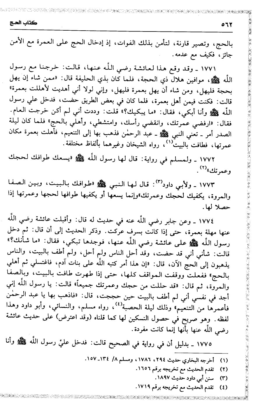 1773 ولأبي داود : قال لها النبي ( طوافك بالبيت ، ) 16 ( وبين الصفا والمروة ، يكفيك لحجك وعمرتك ) وإنما يسعها أو يكفيها طوافها لحجها وعمرتها إذا حصلا لها .