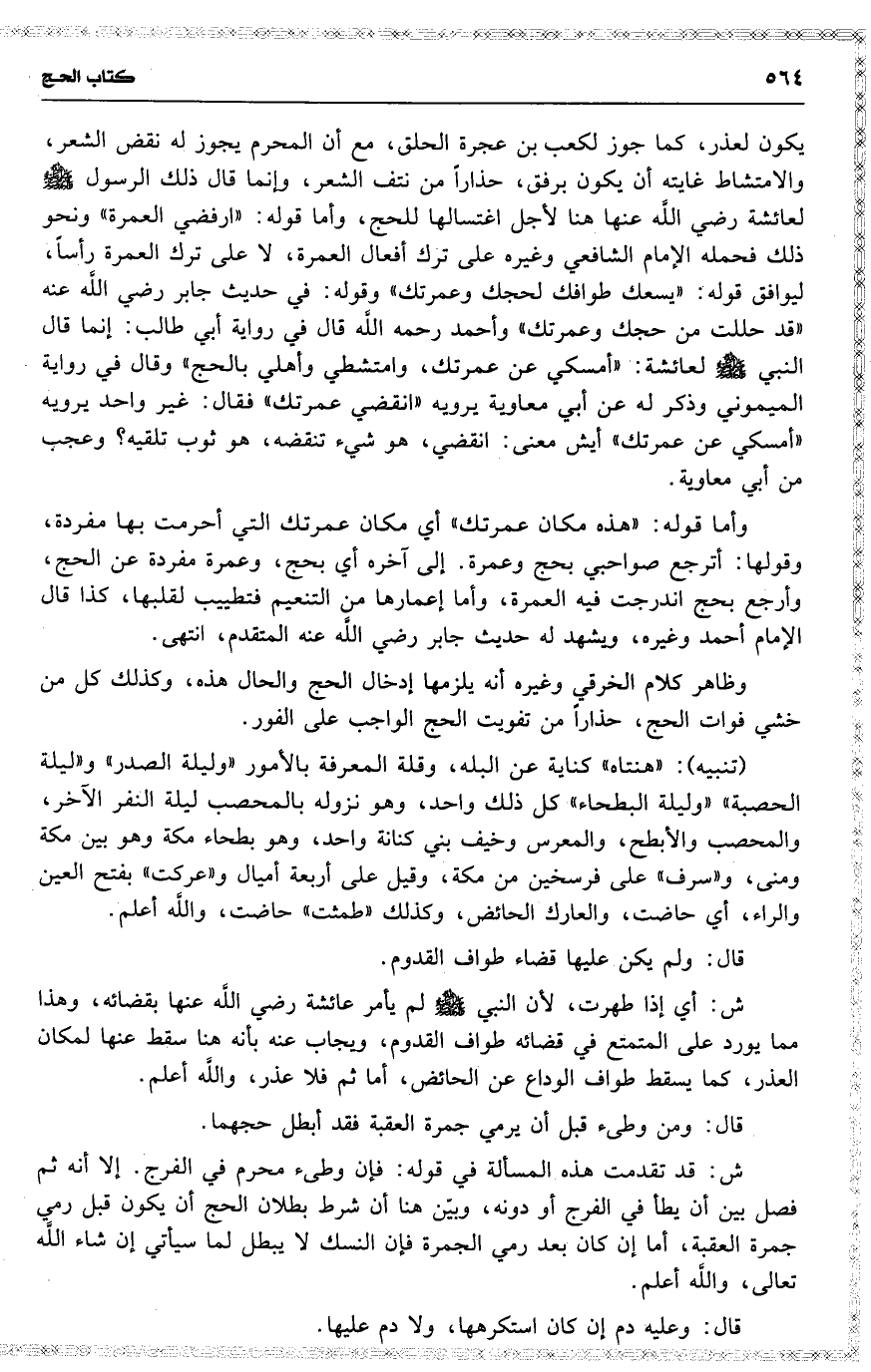 يكون لعذر ، كما جوز لكعب بن عجرة الحلق ، مع أن المحرم يجوز له نقض الشعر ، والامتشاط غايته أن يكون برفق ، حذاراً من نتف الشعر ، وإنما قال ذلك الرسول لعائشة رضي اللَّه عنها هنا لأجل اغتسالها للحج ، وأما قوله : ( ارفضي العمرة ) ونحو ذلك فحمله الإمام الشافعي وغيره على ترك أفعال العمرة ، لا على ترك العمرة رأساً ، ليوافق قوله : ( يسعك طوافك لحجك وعمرتك ) وقوله : في حديث جابر رضي اللَّه عنه ( قد حللت من حجك وعمرتك ) وأحمد رحمه اللَّه قال في رواية أبي طالب : إنما قال النبي لعائشة : ( أمسكي عن عمرتك ، وامتشطي وأهلي بالحج ) وقال في رواية الميموني وذكر له عن أبي معاوية يرويه ( انقضي عمرتك ) فقال : غير واحد يرويه ( أمسكي عن عمرتك ) أيش معنى : انقضي ، هو شيء تنقضه ، هو ثوب تلقيه ؟ وعجب من أبي معاوية .
