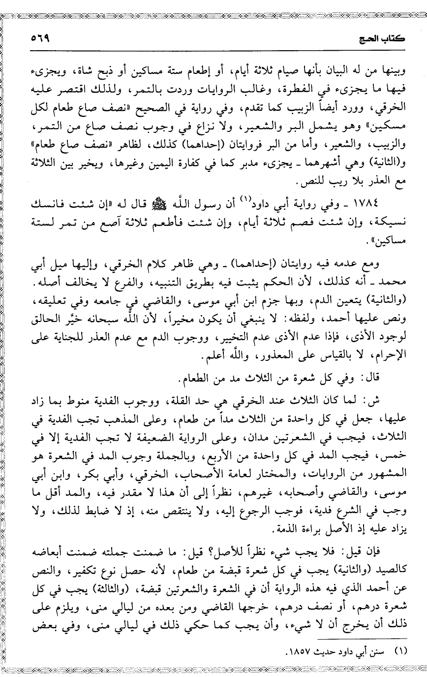 ش : لما كان الثلاث عند الخرقي هي حد القلة ، ووجوب الفدية منوط بما زاد عليها ، جعل في كل واحدة من الثلاث مدا من طعام ، وعلى المذهب تجب الفدية في الثلاث ، فيجب في الشعرتين مدان ، وعلى الرواية الضعيفة لا تجب الفدية إلا في خمس ، فيجب المد في كل واحدة من الأربع ، وبالجملة وجوب المد في الشعرة هو المشهور من الروايات ، والمختار لعامة الأصحاب ، الخرقي ، وأبي بكر ، وابن أبي موسى ، والقاضي وأصحابه ، غيرهم ، نظراً إلى أن هذا لا مقدر فيه ، والمد أقل ما وجب في الشرع فدية ، فوجب الرجوع إليه ، ولا ينتقص منه ، إذ لا ضابط لذلك ، ولا يزاد عليه إذ الأصل براءة الذمة .