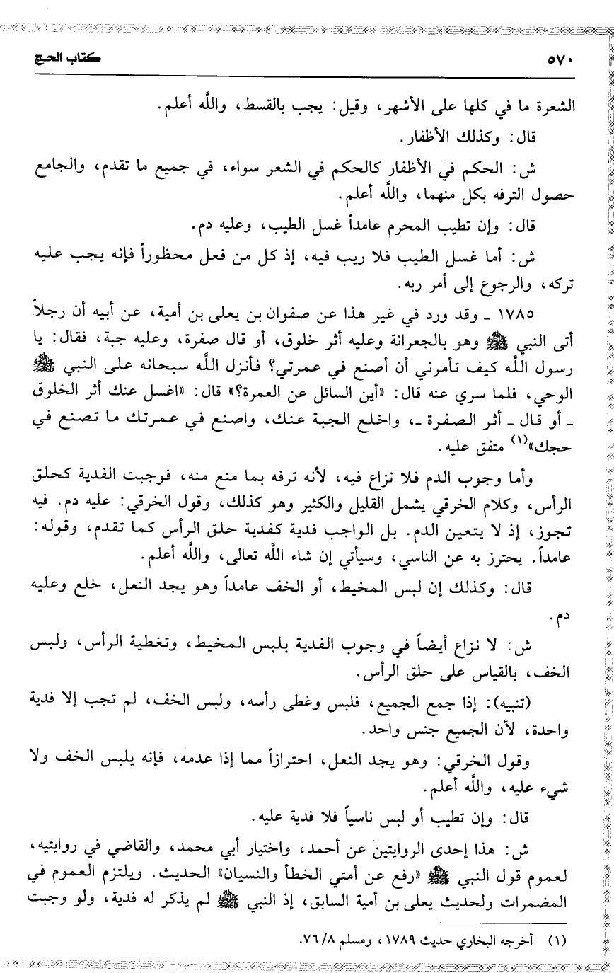 1785 وقد ورد في غير هذا عن صفوان بن يعلى بن أمية ، عن أبيه أن رجلاً أتى النبي وهو بالجعرانة وعليه أثر خلوق ، أو قال صفرة ، وعليه جبة ، فقال : يا رسول اللَّه كيف تأمرني أن أصنع في عمرتي ؟ فأنزل اللَّه سبحانه على النبي الوحي ، فلما سري عنه قال : ( أين السائل عن العمرة ؟ ) قال : ( اغسل عنك أثر الخلوق أو قال أثر الصفرة ، واخلع الجبة عنك ، واصنع في عمرتك ما تصنع في حجك ) متفق عليه .