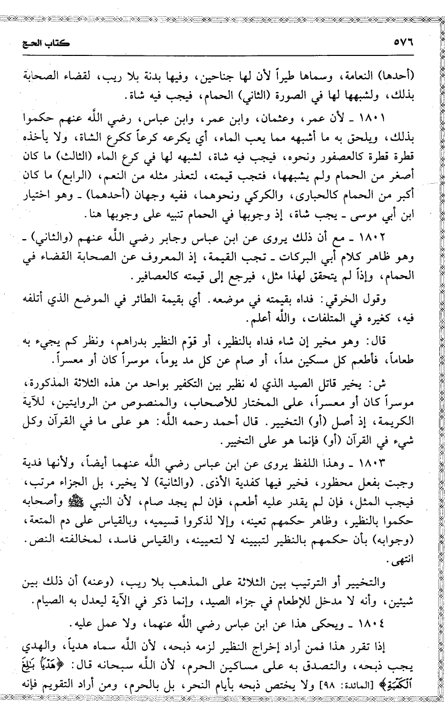 1801 لأن عمر ، وعثمان ، وابن عمر ، وابن عباس ، رضي اللَّه عنهم حكموا بذلك ، ويلحق به ما أشبهه مما يعب الماء ، أي يكرعه كرعاً ككرع الشاة ، ولا يأخذه قطرة قطرة كالعصفور ونحوه ، فيجب فيه شاة ، لشبهه لها في كرع الماء ( الثالث ) ما كان أصغر [ من الحمام ] ولم يشبهها ، فتجب قيمته ، لتعذر مثله من النعم ، ( الرابع ) ما كان أكبر من الحمام كالحبارى ، والكركي ونحوهما ، ففيه وجهان ( أحدهما ) وهو اختيار ابن أبي موسى يجب شاة ، إذ وجوبها في الحمام تنبيه على وجوبها هنا .
