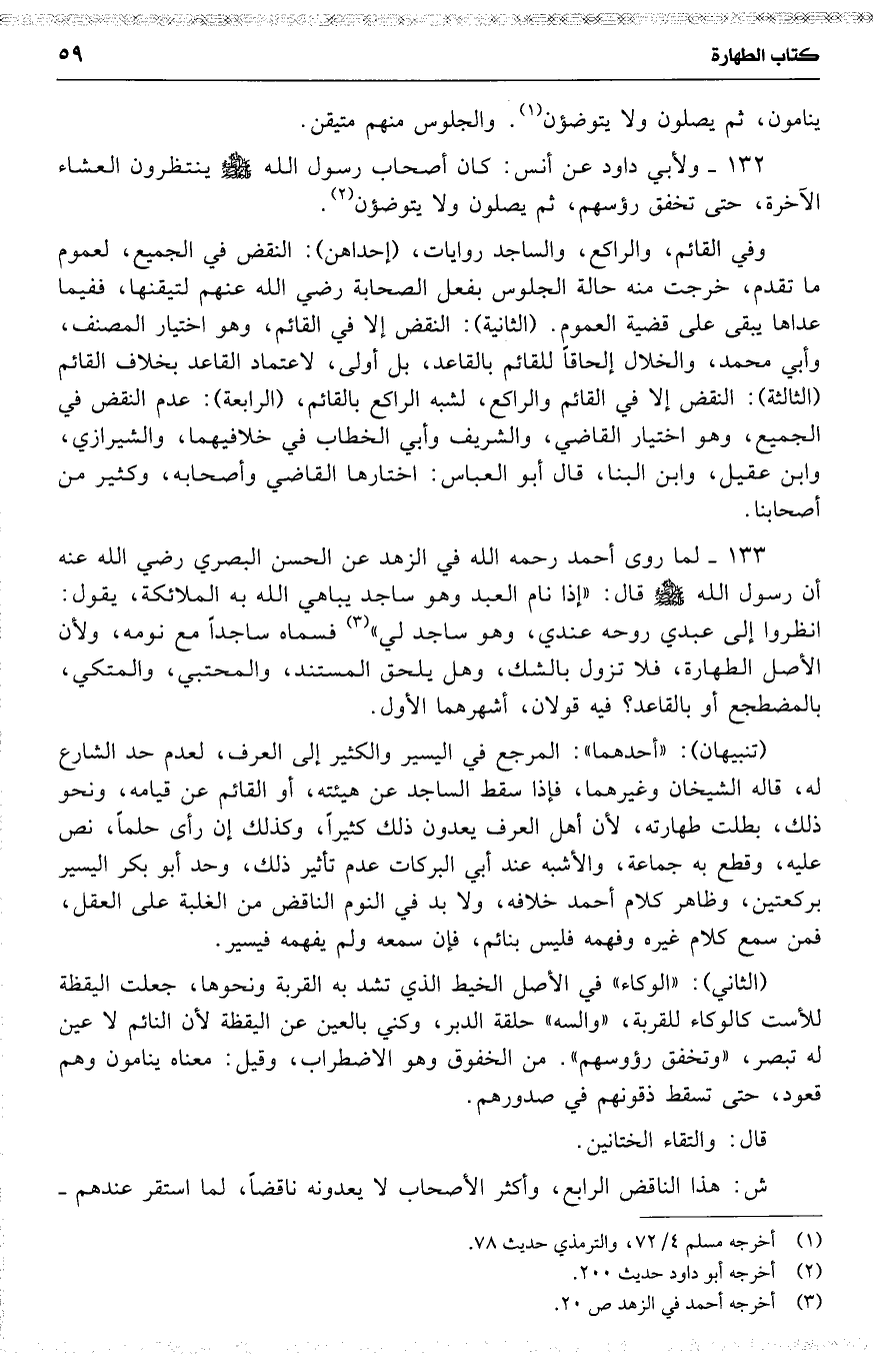 133 لما روى أحمد رحمه الله في الزهد عن الحسن البصري رضي الله عنه أن رسول الله قال : ( إذا نام العبد وهو ساجد يباهي الله به الملائكة ، يقول : انظروا إلى عبدي روحه عندي ، وهو ساجد لي ) فسماه ساجداً مع نومه ، ولأن الأصل الطهارة ، فلا تزول بالشك ، وهل يلحق المستند ، والمحتبي ، والمتكي ، بالمضطجع أو بالقاعد ؟ فيه قولان ، أشهرهما الأول .