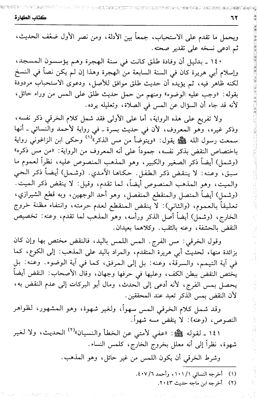 140 بدليل أن وفادة طلق كانت في سنة الهجرة [ وهم يؤسسون المسجد ، وإسلام أبي هريرة كان في السنة السابعة من الهجرة ] وهذا إن لم يكن نصاً في النسخ لكنه ظاهر فيه ، ثم يؤيده أن حديث طلق موافق للأصل ، ودعوى الاستحباب مردودة بقوله : ( وجب عليه الوضوء ) ومنهم من حمل حديث طلق على المس من وراء حائل ، لأنه قد جاء أن السؤال عن المس في الصلاة ، وتعليله يرده .