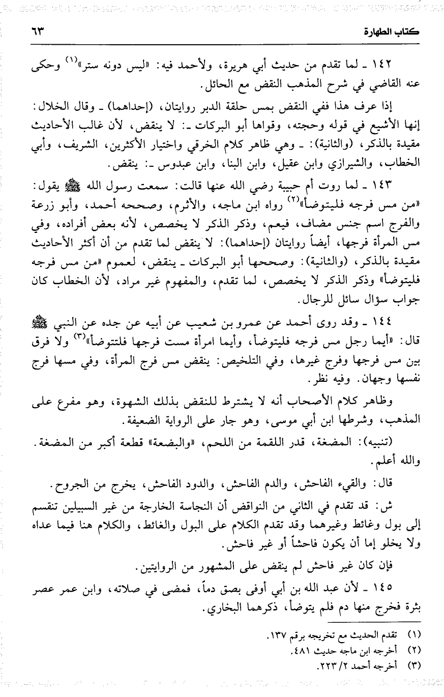 144 وقد روى أحمد عن عمرو بن شعيب عن أبيه عن جده عن النبي قال : ( أيما رجل مس فرجه فليتوضأ ، وأيما امرأة مست فرجها فلتتوضأ ) ولا فرق بين مس فرجها وفرج غيرها ، وفي التلخيص : ينقض مس فرج المرأة ، وفي مسها فرج نفسها وجهان . وفيه نظر .