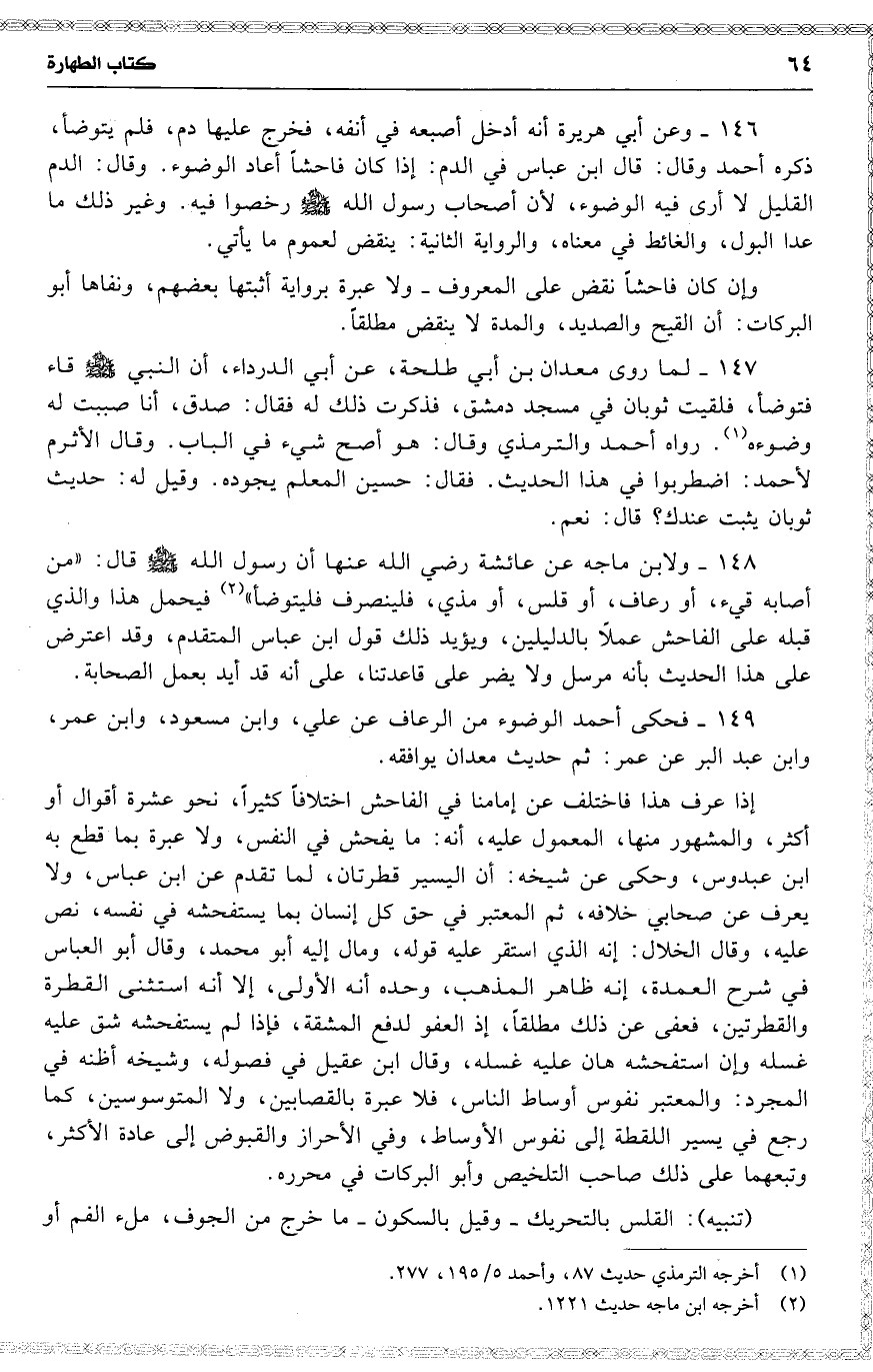 149 فحكى أحمد الوضوء من الرعاف عن علي ، وابن مسعود ، وابن عمر ، وابن عبد البر عن عمر : ثم حديث معدان يوافقه .