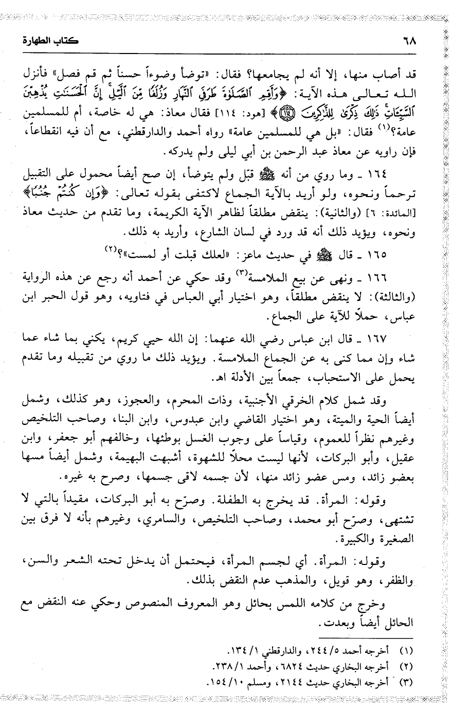 166 ونهى عن بيع الملامسة وقد حكي عن أحمد أنه رجع عن هذه الرواية ( والثالثة ) : لا ينقض مطلقاً ، وهو اختيار أبي العباس في فتاويه ، وهو قول الحبر ابن عباس ، حملًا للآية على الجماع .