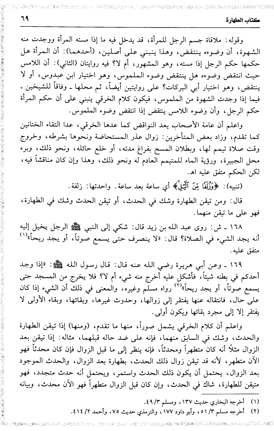 169 وعن أبي هريرة رضي الله عنه قال : قال رسول الله : ( إذا وجد أحدكم في بطنه شيئاً ، فأشكل عليه أخرج منه شيء أم لا ؟ فلا يخرج من المسجد حتى يسمع صوتاً ، أو يجد ريحاً ) رواه مسلم وغيره ، والمعنى في ذلك أن الشيء إذا كان على حال ، فانتقاله عنها يفتقر إلى زوالها ، وحدوث غيرها ، وبقائها ، وبقاء الأولى لا يفتقر [ إلا ] إلى مجرد [ بقائها ] ويكون أولى .