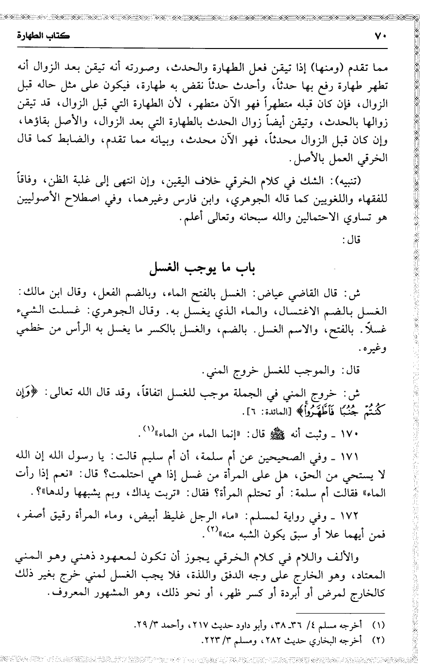 منها ما تقدم ، ( ومنها ) إذا تيقن الطهارة والحدث ، وشك في السابق منهما ، فإنه على ضد حاله قبلهما ، مثاله : إذا تيقن بعد الزوال مثلًا أنه كان متطهراً ومحدثاً ، فإنه ينظر إلى ما قبل الزوال فإن كان محدثاً فهو الآن متطهر ، لأنه قد تيقن زوال ذلك الحدث ، بطهارة بعد الزوال ، والحدث الموجود بعد الزوال ، يحتمل أن يكون ذلك الحدث واستمر ، ويحتمل أنه حدث متجدد ، فهو متيقن للطهارة ، شاك في الحدث ، وإن كان قبل الزوال متطهراً فهو الآن محدث ، وبيانه مما تقدم ( ومنها ) إذا تيقن فعل الطهارة والحدث ، وصورته أنه تيقن بعد الزوال أنه تطهر طهارة رفع بها حدثاً ، وأحدث حدثاً نقض به طهارة ، فيكون على مثل حاله قبل الزوال ، فإن كان قبله متطهراً فهو الآن متطهر ، لأن الطهارة التي قبل الزوال ، قد تيقن زوالها بالحدث ، وتيقن أيضاً زوال الحدث بالطهارة التي بعد الزوال ، والأصل بقاؤها ، وإن كان قبل الزوال محدثاً ، فهو الآن محدث ، وبيانه مما تقدم ، والضابط كما قال الخرقي العمل بالأصل .