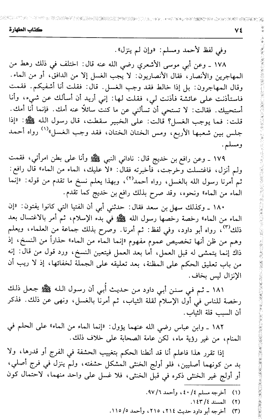 179 وعن رافع بن خديج قال : ناداني النبي وأنا على بطن امرأتي ، فقمت ولم أنزل ، فاغتسلت وخرجت ، فأخبرته فقال : ( لا عليك ، الماء من الماء ) قال رافع : ثم أمرنا رسول الله بالغسل ، رواه أحمد ، وبهذا يعلم نسخ ما تقدم من قوله : ( إنما الماء من الماء ) ونحوه ، وقد صرح بذلك رافع بن خديج [ كما تقدم ] .