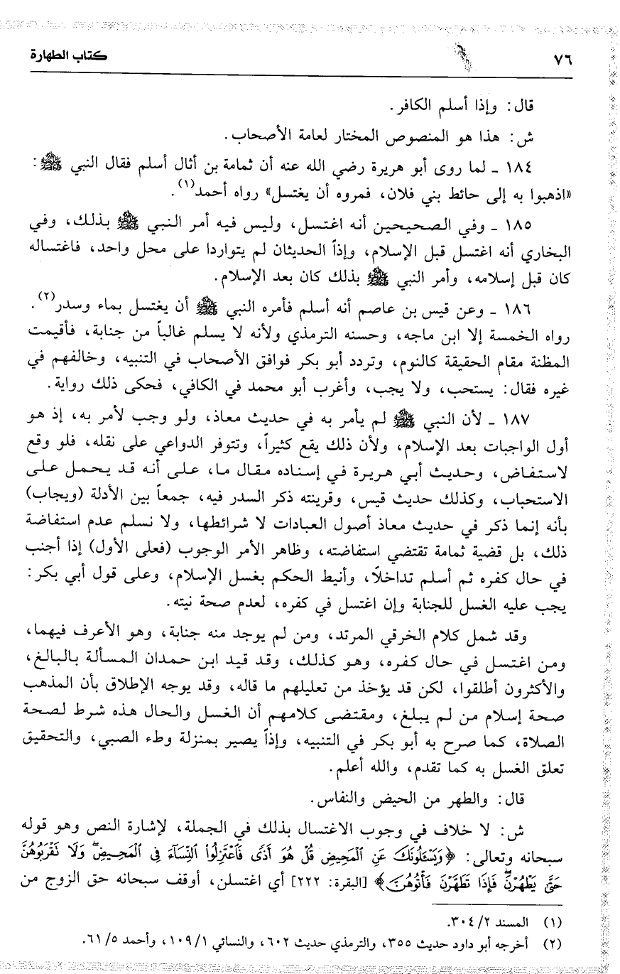 184 لما روى أبو هريرة رضي الله عنه أن ثمامة بن أثال أسلم فقال النبي : ( اذهبوا به إلى حائط بني فلان ، فمروه أن يغتسل ) رواه أحمد .