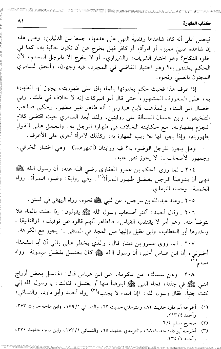 204 لما روى الحكم بن عمرو الغفاري رضي الله عنه ، أن رسول الله نهى أن يتوضأ الرجل بفضل طهور المرأة . وفي رواية : وضوء المرأة . رواه الخمسة ، وحسنه الترمذي .