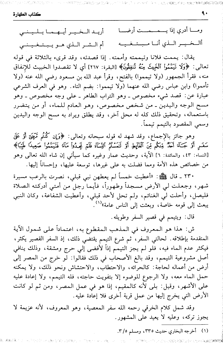 ش : هذا هو المعروف في المذهب المقطوع به ، اعتماداً على شمول الآية المتقدمة بإطلاقه . لحالتي السفر ، ثم شرع التيمم يقتضي ذلك ، إذ السفر القصير يكثر ، فيكثر عدم الماء فيه ، فلو لم يجز التيمم إذاً لأفضى إلي حرج ومشقة ، وذلك ينافي أصل مشروعية التيمم ، وقد بالغ الأصحاب في ذلك فقالوا : لو خرج من المصر إلى أرض من أعماله لحاجة : كالحرائه ، والاحتطاب ، والاحتشاش ونحو ذلك ، ولا يمنكه حمل الماء مته ، ولا الرجوع للوضوء إلا بتفويت حاجته ، فله التيمم ، ولا إعادة عليه على الأشهر ، وقيل : بلى لأنه كالمقيم ، إذا هو في عمل المصر ، ومن ثم لو كانت الأرض التي يخرج إليها من عمل قرية أخرى فلا إعادة عليه .