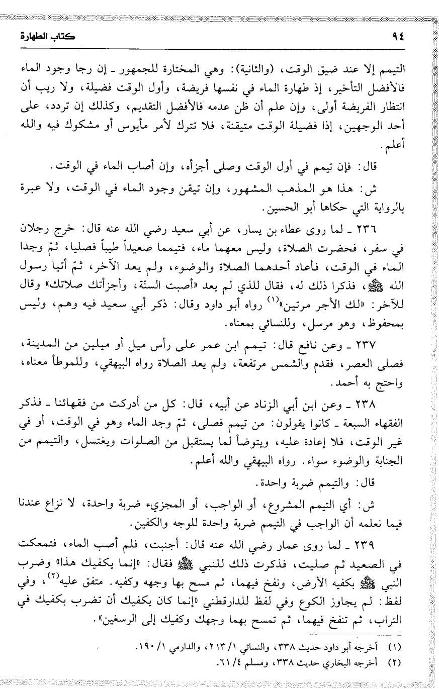 237 وعن نافع قال : تيمم ابن عمر على رأس ميل أو ميلين من المدينة ، فصلى العصر ، فقدم والشمس مرتفعة ، ولم يعد [ الصلاة ] رواه البيهقي ، وللموطأ معناه ، واحتج به أحمد .
