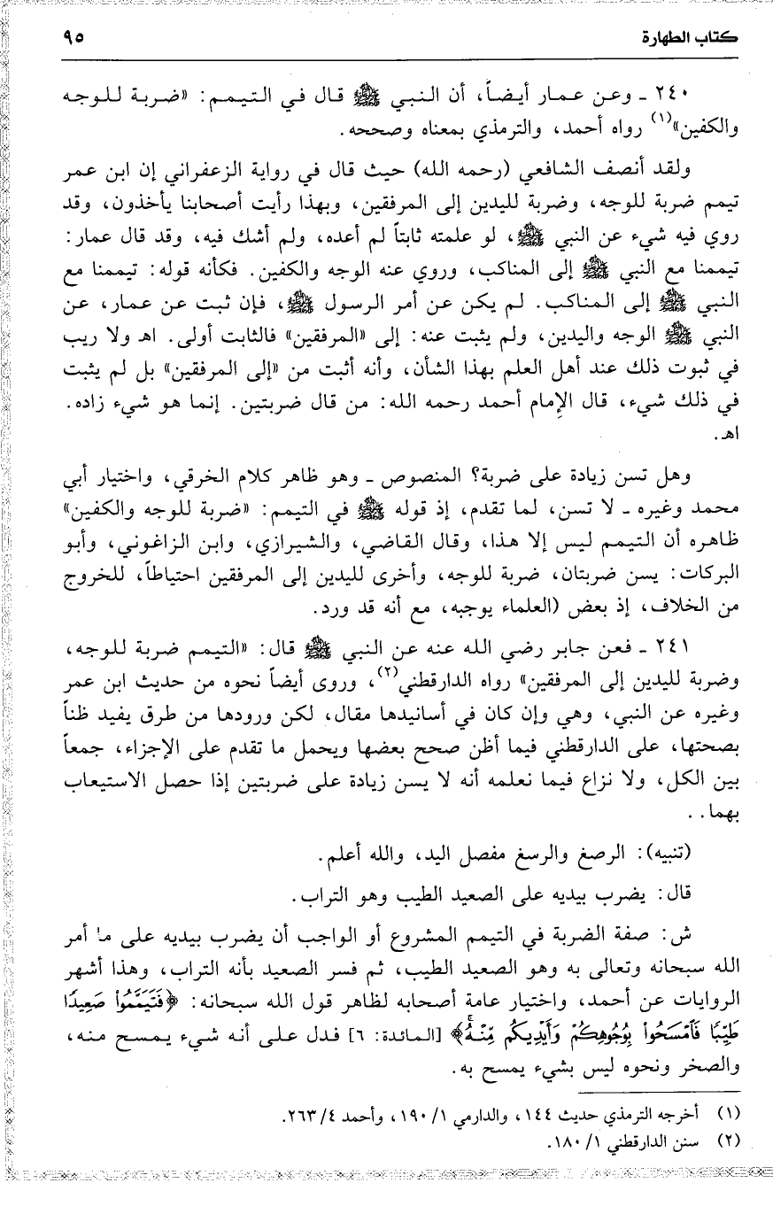240 وعن عمار أيضاً ، أن النبي قال في التيمم ( ضربة للوجه والكفين ) رواه أحمد ، والترمذي بمعناه وصححه .
