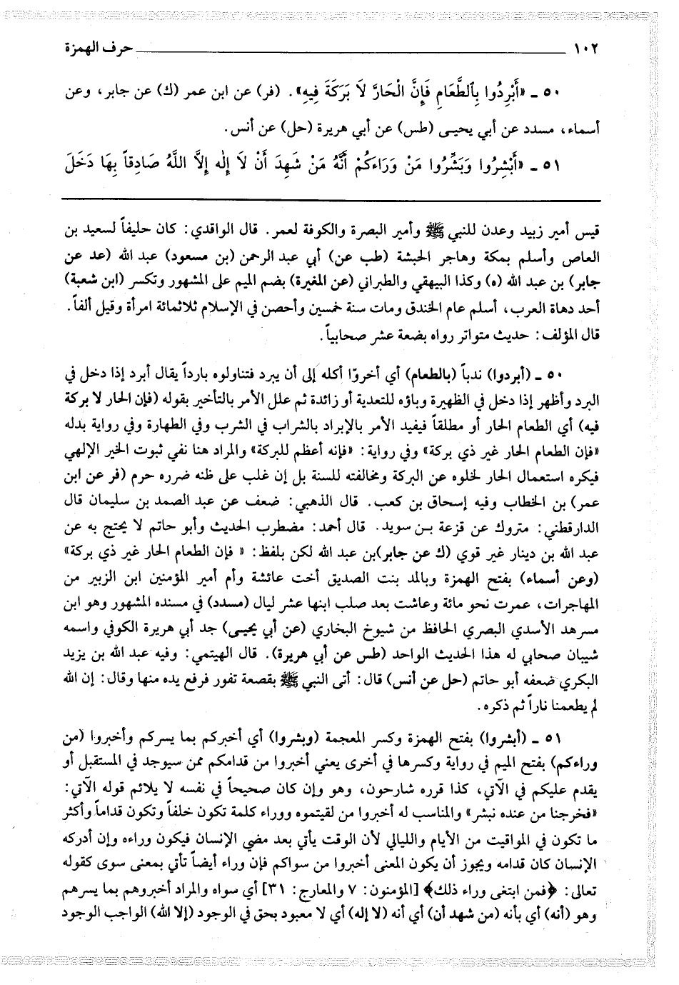 50 - (أبردوا) ندبا (بالطعام) أي أخروا أكله إلى أن يبرد فتناولوه باردا يقال أبرد إذا دخل في البرد وأظهر إذا دخل في الظهيرة وباؤه للتعدية أو زائدة ثم علل الأمر بالتأخير بقوله (فإن الحار لابركة فيه) أي الطعام الحار أو مطلقا فيفيد الأمر بالابراد بالشراب في الشرب وفي الطهارة وفي رواية بدله " فإن الطعام الحار غير ذي بركة " وفي رواية : " فإنه أعظم للبركة " والمراد هنا نفي ثبوت الخير الإلهي