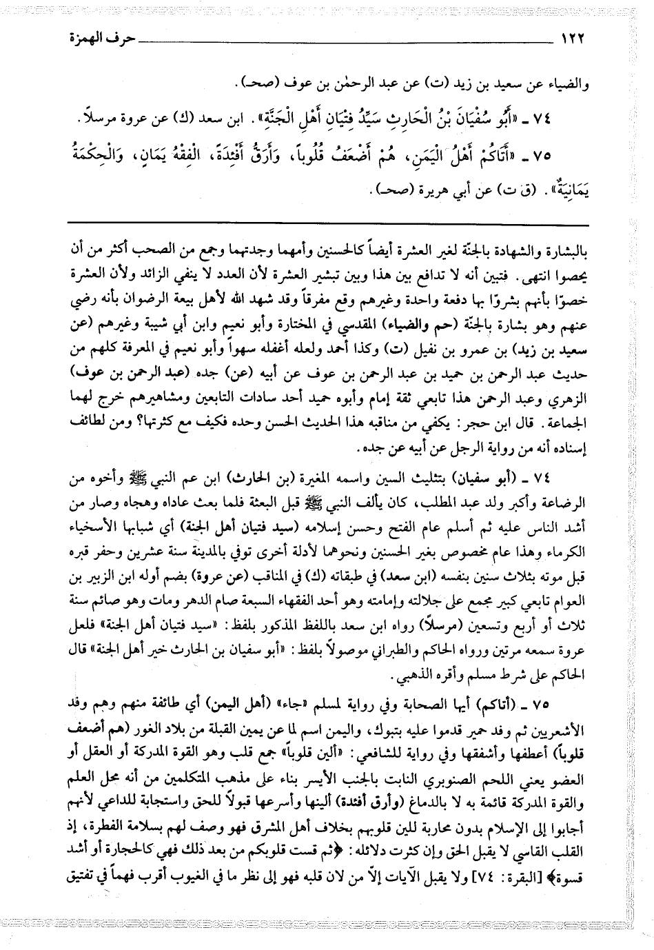 قال ابن حجر : يكفي من مناقبه هذا الحديث الحسن وحده فكيف مع كثرتها ؟ ومن لطائف إسناده أنه من رواية الرجل عن أبيه عن جده 74 - (أبو سفيان) بتثليث السين واسمه المغيرة (بن الحارث) ابن عم النبي صلى الله عليه وسلم وأخوه من الرضاعة وأكبر ولد عبد المطلب ، كان يألف النبي صلى الله عليه وسلم قبل البعثة فلما بعث عاداه وهجاه وصار من