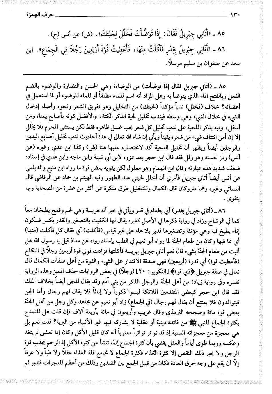 85 - (أتاني جبريل فقال إذا توضأت) من الوضاءة وهي الحسن والنضارة والوضوء بالضم الفعل وبالفتح الماء الذي يتوضأ به وهل المراد أنه اسم للماء مطلقا أو للمعد للوضوء أو لما استعمل في أعضائه ؟ خلاف (فخلل) ندبا مؤكدا (لحيتك) من التخليل وهو تفريق الشعر ونحوه وأصله إدخال الشئ في خلال الشئ وهو وسطه فيندب تخليل لحية الذكر الكثة ، والأفضل كونه بأصابع يمناه ومن