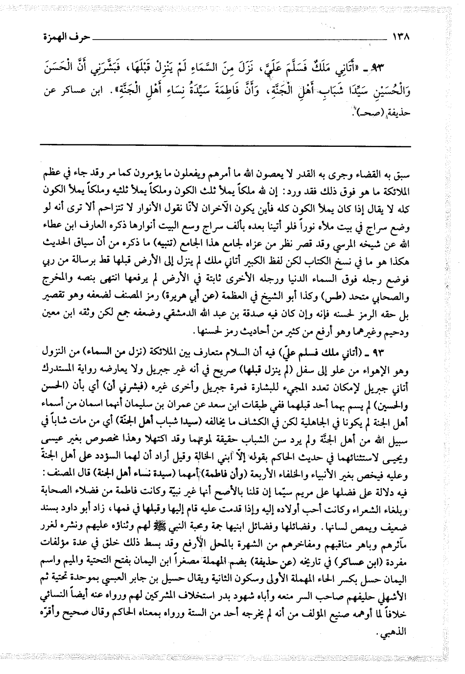 93 - (أتاني ملك فسلم علي) فيه أن السلام متعارف بين الملائكة (نزل من السماء) من النزول وهو الإهواء من علو إلى أسفل (لم ينزل قبلها) صريح في أنه غير جبريل ولا يعارضه رواية المستدرك أتاني جبريل لإمكان تعدد المجئ للبشارة فمرة جبريل وأخرى غيره (فبشرني أن) أي بأن (الحسن والحسين) لم يسم بهما أحد قبلهما ففي طبقات ابن سعد عن عمران بن سليمان أنهما اسمان من أسماء أهل الجنة لم يكونا في الجاهلية لكن في الكشاف ما يخالفه (سيدا شباب أهل الجنة) أي من مات شابا في سبيل الله من أهل الجنة ولم يرد سن الشباب حقيقة لموتهما وقد اكتهلا وهذا مخصوص بغير عيسى ويحيى لاستثنائهما في حديث الحاكم بقوله إلا ابني الخالة وقيل أراد أن لهما السؤدد على أهل الجنة وعليه فيخص بغير الأنبياء والخلفاء الأربعة (وأن فاطمة) أمهما (سيدة نساء أهل الجنة) قال المصنف : فيه دلالة على فضلها على مريم سيما إن قلنا بالأصح أنها غير نبية وكانت فاطمة من فضلاء الصحابة وبلغاء الشعراء وكانت أحب أولاده إليه وإذا قدمت عليه قام إليها وقبلها في فمها ، زاد أبو داود بسند ضعيف ويمص لسانها.