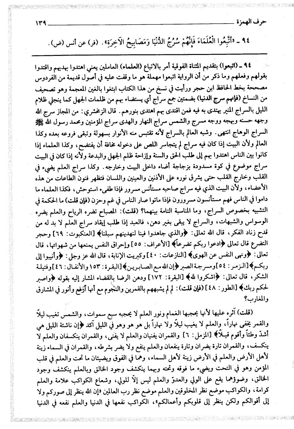 وشبه العالم بالسراج لأنه تقتبس منه الأنوار بسهولة وتبقى فروعه بعده وكذا العالم ولأن البيت إذا كان فيه سراج لم يتجاسر اللص على دخوله مخافة أن يفتضح وكذا العلماء إذا كانوا بين الناس اهتدوا بهم إلى طلب الحق والسنة وإزاحة ظلم الجهل والبدعة ولأنه إذا كان في البيت سراج موضوع في كوة مسدودة بزجاجة أضاء داخل البيت وخارجه وكذا سراج العلم يضئ في القلب وخارج القلب حتى يرق نوره على الأذنين والعينين واللسان فتظهر فنون الطاعات من هذه الأعضاء ولأن البيت الذي فيه سراج صاحبه مستأنس مسرور فإذا طفئ استوحش فكذا العلماء ما داموا في الناس فهم مستأنسون مسرورون فإذا ماتوا صار الناس في غم وحزن (فإن قلت) ما الحكمة في التشبيه بخصوص السراج وما المناسبة التامة بينهما (قلت) المصباح تضره الرياح والعلم يضره الوسواس والشبهات والسراج لا يبقى بغير دهن فالعبد طلب إيقاد سراج العلم لا بد له من زناد الفكر ، قال الله تعالى : (والذين جاهدوا فينا لنهدينهم سبلنا) * (العنكبوت : 69) وحجر التضرع قال تعالى * (ادعوا ربكم تضرعا) * (الأعراف : 55) وإحراق النفس بمنعها من شهواتها قال تعالى * (ونهى النفس عن الهوى) * (النازعات : 40) وكبريت الإنابة قال الله عز وجل * (وأنيبوا إلى ربكم) * ومسرجة الصبر * (إن الله مع الصابرين) * وفتيلة الشكر قال تعالى * (اشكروا لله) * ودهن الرضا بالقضاء المشار إليه بقوله * (واصبر لحكم ربك) * (فإن قلت) لم لم يشبههم بالقمرين والنجوم مع أنها أرفع وأنور في المشارق والمغارب ؟ (قلت آثره عليها لأنها يحجبها الغمام ونور العلم لا يحجبه سبع سماوات والشمس تغيب ليلا والقمر يختفي نهارا والعلم لا يغيب ليلا ولا نهارا بل هو هو وهو في الليل آكد * (إن ناشئة الليل هي أشد وطئا وأقوم قيلا) * والقمران يفنيان والعلم لا يفنى والقمران ينكسفان والعلم لا