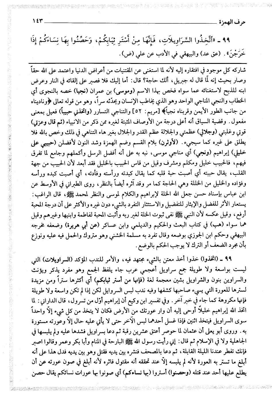 99 - (اتخذوا) خذوا أخذ معتن بالشئ مجتهد فيه ، والأمر للندب المؤكد (السراويلات) التي ليست بواسعة ولا طويلة جمع سراويل أعجمي عرب جاء بلفظ الجمع وهو مفرد يذكر ويؤنث والسراوين بنون والشراويل بشين معجمة لغة (فإنها من أستر ثيابكم) أي أكثرها سترا ومن مزيدة لسترها للعورة التي يسئ صاحبها كشفها وفيه ندب لبس السراويل لكن إذا لم تكن واسعة ولا طويلة فإنها مكروهة كما جاء في خبر آخر وفي تفسير ابن وكيع أن إبراهيم أول من تسرول قال الداراني : لما اتخذ الله إبراهيم خليلا أوحى إليه أن وار عورتك من الأرض فكان لا يتخذ من كل شئ إلا واحدا سوى السراويل فيتخذ اثنين فإذا غسل أحدهما لبس الآخر حتى لا يأتي عليه حال إلا وعورته مستورة به وروى أبو يعلى أن عثمان لما حوصر أعتق عشرين رقبة ثم دعا بسراويل فشدها عليه ولم يلبسها في الجاهلية ولا في الإسلام ثم قال : إني رأيت رسول الله صلى الله عليه وسلم البارحة في المنام وأبا بكر وعمر وقالوا اصبر فإنك تفطر عندنا الليلة القابلة ثم دعا بالمصحف فنشره بين يديه فقتل وهو بين يديه فدل هذا على أنه أبلغ ما تستر به العورة لأنه لم يلبسه إلا عند تحققه أنه مقتول فآثره لأنه أبلغ في صون عورته عن أن يطلع عليها أحد عند قتله (وحصنوا) استروا (بها نساءكم) أي صونوا بها عورات نسائكم يقال حصن