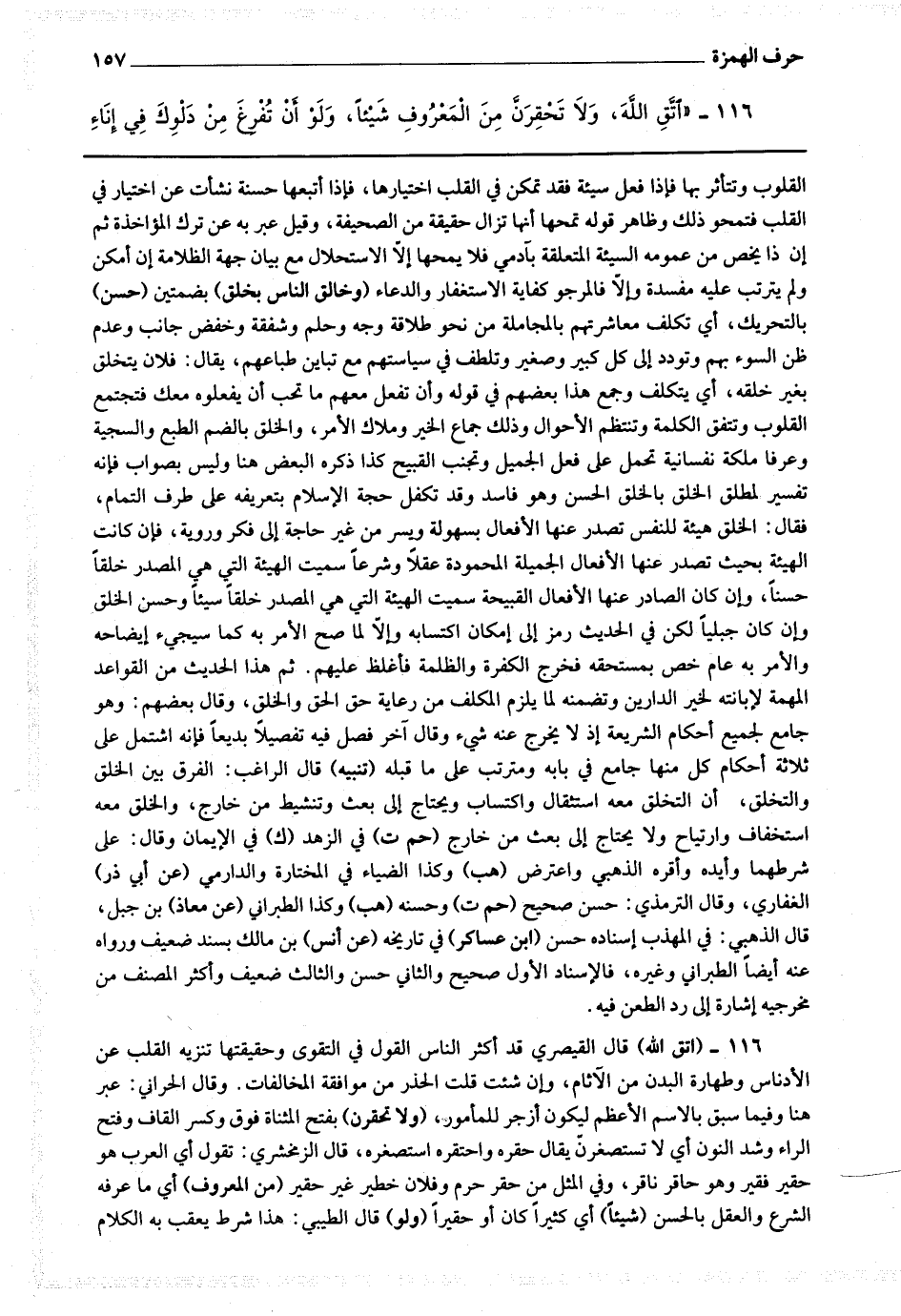 116 - (اتق الله) قال القيصري : قد أكثر الناس القول في التقوى وحقيقتها تنزيه القلب عن الأدناس وطهارة البدن من الآثام وإن شئت قلت : الحذر من موافقة المخالفات.