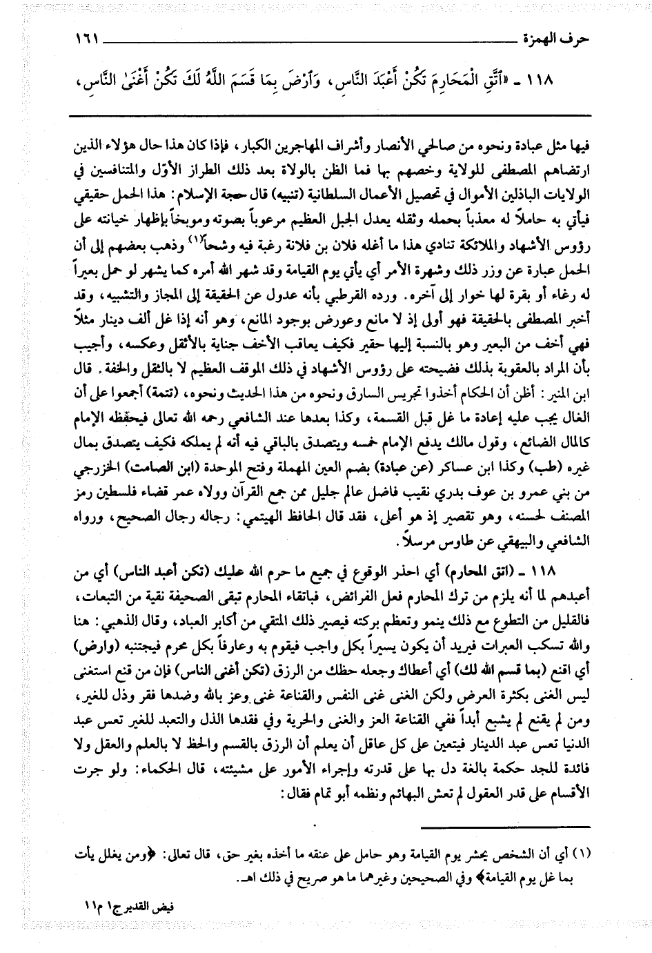 118 - (اتق المحارم) أي احذر الوقوع في جميع ما حرم الله عليك (تكن أعبد الناس) أي من أعبدهم لما أنه يلزم من ترك المحارم فعل الفرائض فباتقاء المحارم تبقى الصحيفة نقية من التبعات فالقليل من التطوع مع ذلك ينمو وتعظم بركته فيصير ذلك المتقي من أكابر العباد وقال الذهبي : هنا والله تكسب العبرات فيريد أن يكون يسيرا بكل واجب فيقوم به وعارفا بكل محرم فيجتنبه (وارض) أي اقنع (بما قسم الله لك) أي أعطاك وجعله حظك من الرزق (تكن أغنى الناس) فإن من قنع استغنى ليس الغنى بكثرة العرض ولكن الغنى غنى النفس والقناعة غنى وعز بالله وضدها فقر وذل للغير ، ومن لم يقنع لم يشبع أبدا ففي القناعة العز والغنى والحرية وفي فقدها الذل والتعبد للغير تعس عبد الدنيا تعس عبد الدينار فيتعين على كل عاقل أن يعلم أن الرزق بالقسم والحظ لا بالعلم والعقل ولا فائدة للجد حكمة بالغة دل بها على قدرته وإجراء الأمور على مشيئته قال الحكماء : ولو جرت الأقسام على قدر العقول لم تعش البهائم ونظمه أبو تمام فقال :