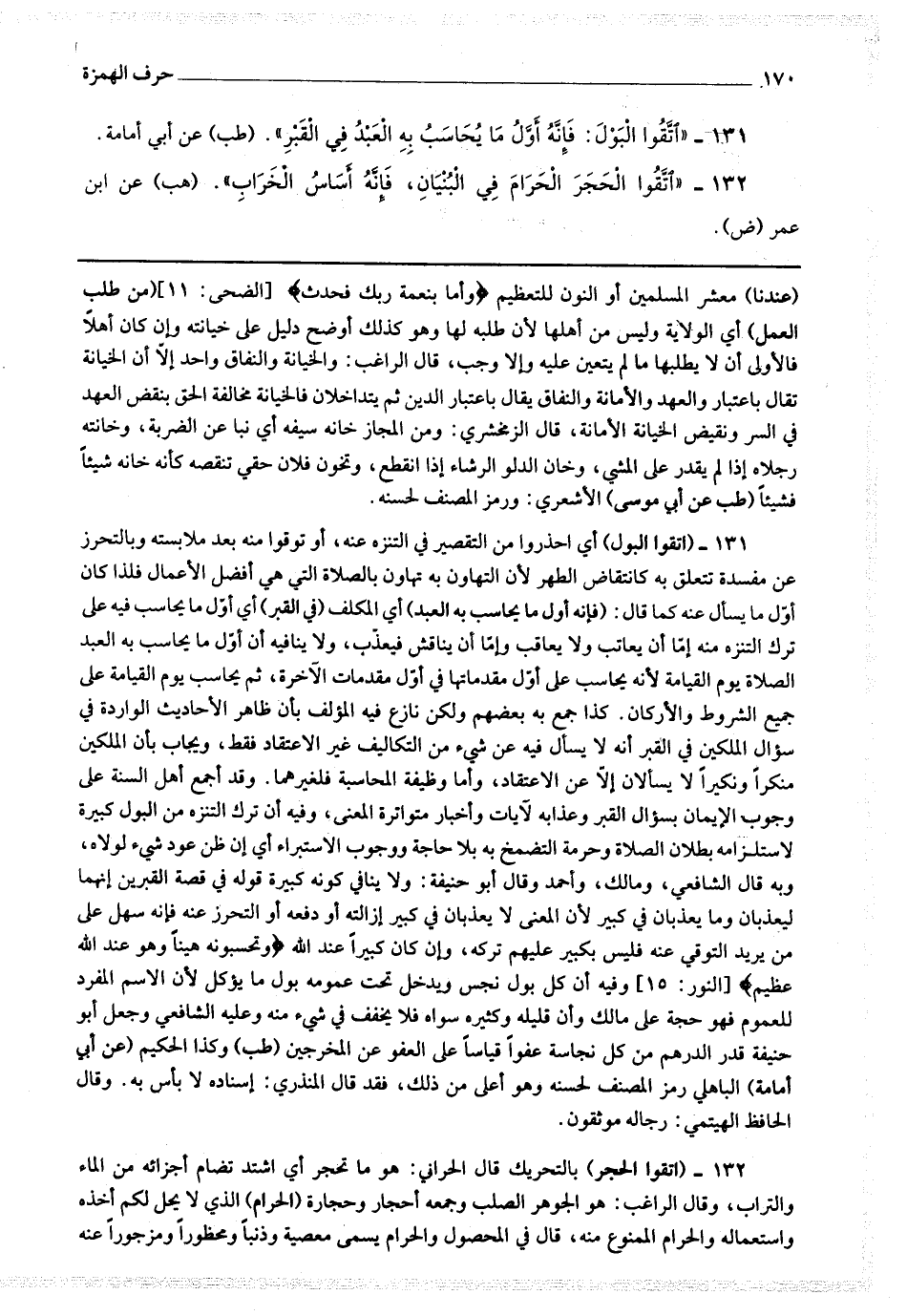 131 - (اتقوا البول) أي احذروا من التقصير في التنزه عنه أو توقوا منه بعد ملابسته وبالتحرز عن مفسدة تتعلق به كانتقاص الطهر لأن التهاون به تهاون بالصلاة التي هي أفضل الأعمال فلذا كان أول ما يسئل عنه كما قال فإنه أول ما يحاسب به العبد) أي المكلف (في القبر) أي أول ما يحاسب فيه على ترك التنزه منه فإما أن يعاتب ولا يعاقب وإما أن يناقش فيعذب ولا ينافيه أن أول ما يحاسب به العبد الصلاة يوم القيامة لأنه يحاسب على أول مقدماتها في أول مقدمات الآخرة ثم يحاسب يوم القيامة على جميع الشروط والأركان كذا جمع به بعضهم ولكن نازع فيه المؤلف بأن ظاهر الأحاديث الواردة في