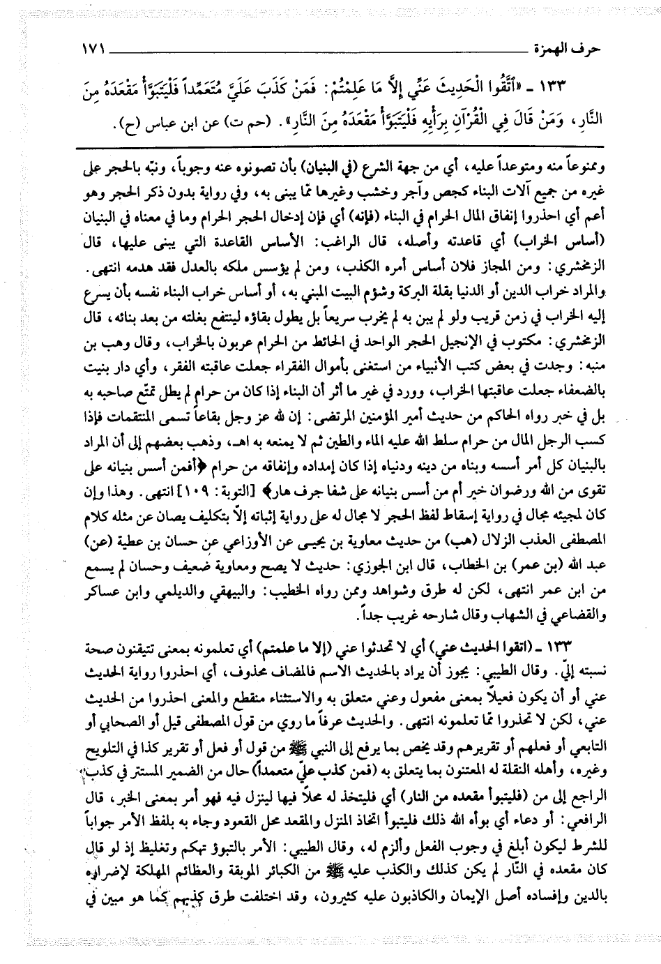 133 - (اتقوا الحديث عني) أي لا تحدثوا عني (إلا بما علمتم) أي تعلمونه بمعنى تتيقنون صحة نسبته إلي وقال الطيبي : يجوز أن يراد بالحديث الاسم فالمضاف محذوف أي احذروا رواية الحديث عني أو أن يكون فعيلا بمعنى مفعول وعني متعلق به والاستثناء منقطع والمعنى احذروا من الحديث عني لكن لا تحذروا مما تعلمونه انتهى والحديث عرفا ما روي من قول المصطفى قيل أو الصحابي أو التابعي أو فعلهم أو تقريرهم وقد يخص بما يرفع إلى النبي صلى الله عليه وسلم من قول أو فعل أو تقرير كذا في التلويح وغيره وأهله النقلة له المعتنون بما يتعلق به (فمن كذب علي متعمدا) حال من الضمير المستتر في كذب الراجع إلى من (فليتبوأ مقعده من النار) أي فليتخذ له محلا فيها لينزل فيه فهو أمر بمعنى الخبر قال الرافعي : أو دعاء أي بوأه الله ذلك فليتبوأ اتخاذ المنزل والمقعد محل القعود وجاء به بلفظ الأمر جوابا للشرط ليكون أبلغ في وجوب الفعل وألزم له وقال الطيبي : الأمر بالتبوؤ تهكم وتغليظ إذ لو قال