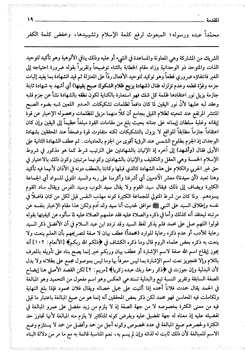 الغير فانتفائه ضروري قطعا وهو توكيد لتوحيد الأفعال ردا على المعتزلة ثم قيد الشهادة بما يفيد إثبات جزمه وقوة قطعه وعدم تزلزله فقال (شهادة يزيح ظلام الشكوك صبح يقينها) أي أشهد به شهادة ثابتة جازمة يزيل نورا اعتقادها ظلمة كل شك فهو استعارة بالكناية لكونه نطقه بالشهادة نشأ عن جزم قلبه وعقد لبه عليها لأن نور اليقين لما كان واقعا لظلمات تشكيكات العدو اللعين شبه بضوء الصبح المنتشر المرتفع عند تنحيته لظلام الليل بجامع أن كلا منهما مزيل للظلمات ومحصوله الإخبار عن قوة إيقانه وغلبة سلطان إيمانه على جنانه بحيث بلغ من مقامات القوة مبلغا عظيما إلى اليقين وإن كان اعتقادا جازما مطابقا للواقع لا يزول بالتشكيكات لكنه متفاوت قوة وضعفا عند المحققين بشهادة الوجدان إذ الجزم بطلوع الشمس عند الرؤية أقوى من الجزم بالعاديات.