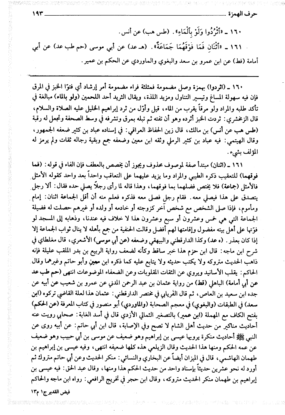 160 - (اثردوا) بهمزة وصل مضمومة فمثلثة فراء مضمومة أمر ارشاد أي فتوا الخبز في المرق فإن فيه سهولة المساغ وتيسير التناول ومزيد اللذة ويقال الثريد أحد اللحمين (ولو بماء) مبالغة في تأكيد طلبه والمراد ولو مرقا يقرب من الماء قيل وأول من ثرد إبراهيم الخليل عليه الصلاة والسلام ، قال الزمخشري : ثردت الخبز أثرده وهو أن تفته ثم تبله بمرق وتشرقه في وسط الصحيفة وتجعل له رقبة (طس هب عن أنس) بن مالك زين الحافظ العراقي في إسناده عباد بن كثير ضعفه الجمهور وقال الهيتمي : فيه عباد بن كثير الرملي وثقه ابن معين وضعفه جمع وبقية رجاله ثقات ولم يرمز له