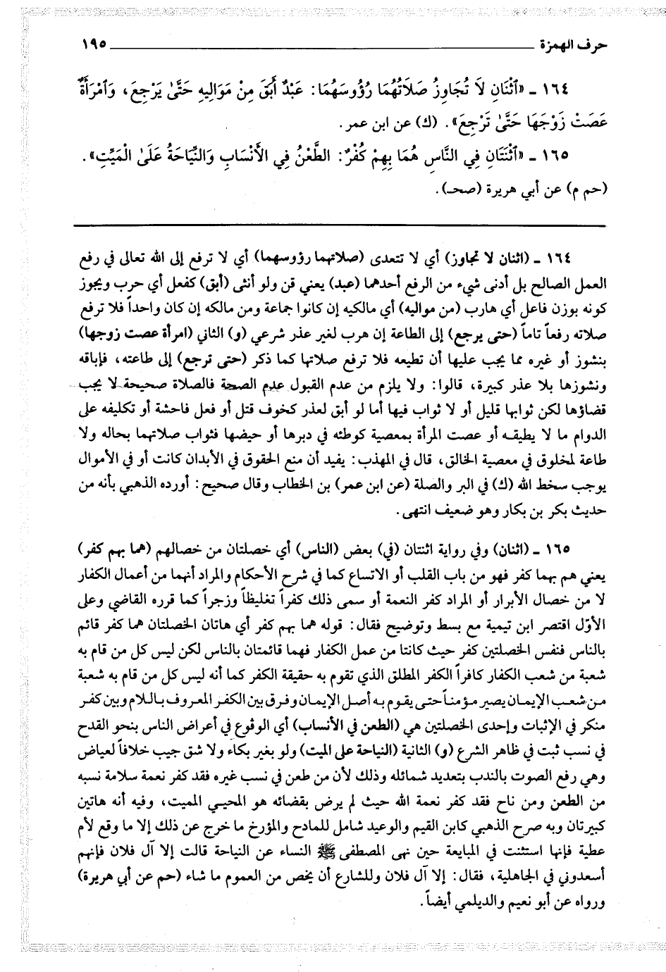 165 - (اثنان) وفي رواية اثنتان (في) بعض (الناس) أي خصلتان من خصالهم (هما بهم كفر) يعني هم بهما كفر فهو من باب القلب أو الاتساع كما في شرح الأحكام والمراد أنهما من أعمال الكفار لا من خصال الأبرار أو المراد كفر النعمة أو سمي ذلك كفرا تغليظا وزجرا كما قرره القاضي وعلى الأول اقتصر ابن تيمية مع بسط وتوضيح فقال قوله هما بهم كفر أي هاتان الخصلتان هما كفر قائم