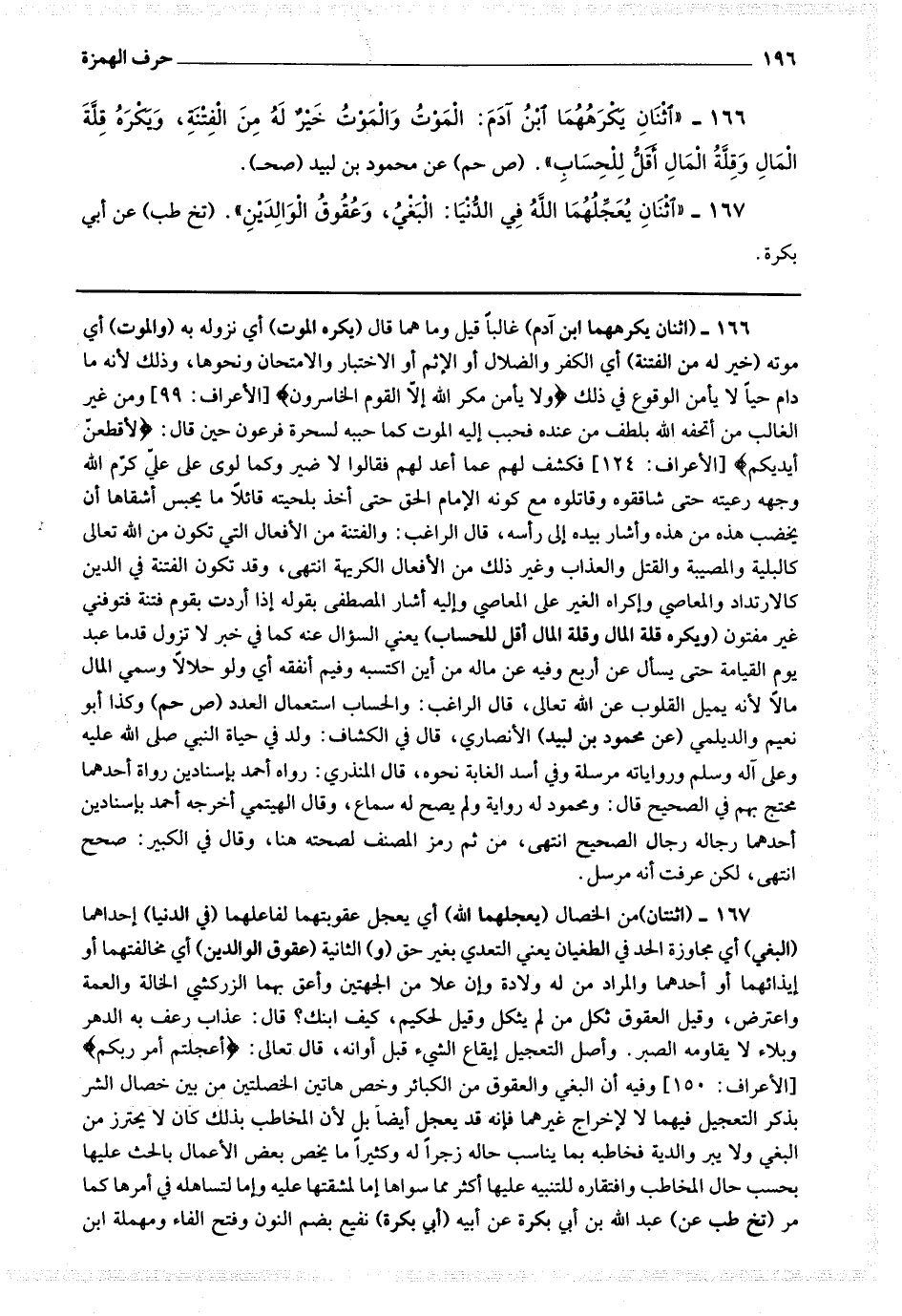 166 - (اثنان يكرههما ابن آدم) غالبا قيل : وما هما قال : (يكره الموت) أي نزوله به (والموت) أي موته (خير له من الفتنة) أي الكفر والضلال أو الإثم أو الاختبار والامتحان ونحوهما وذلك لأنه ما دام حيا لا يأمن الوقوع في ذلك ولا يأمن مكر الله إلا القوم الخاسرون ومن غير الغالب من أتحفه الله بلطف من عنده فحبب إليه الموت كما حببه لسحرة فرعون حين قال لأقطعن أيديكم فكشف لهم عما أعد لهم فقالوا لا ضير وكما لوى على علي كرم الله وجهه رعيته حتى شاقوه وقاتلوه مع كونه الإمام الحق حتى أخذ بلحيته قائلا : ما يحبس أشقاها أن يخضب هذه من هذه وأشار بيده إلى رأسه.