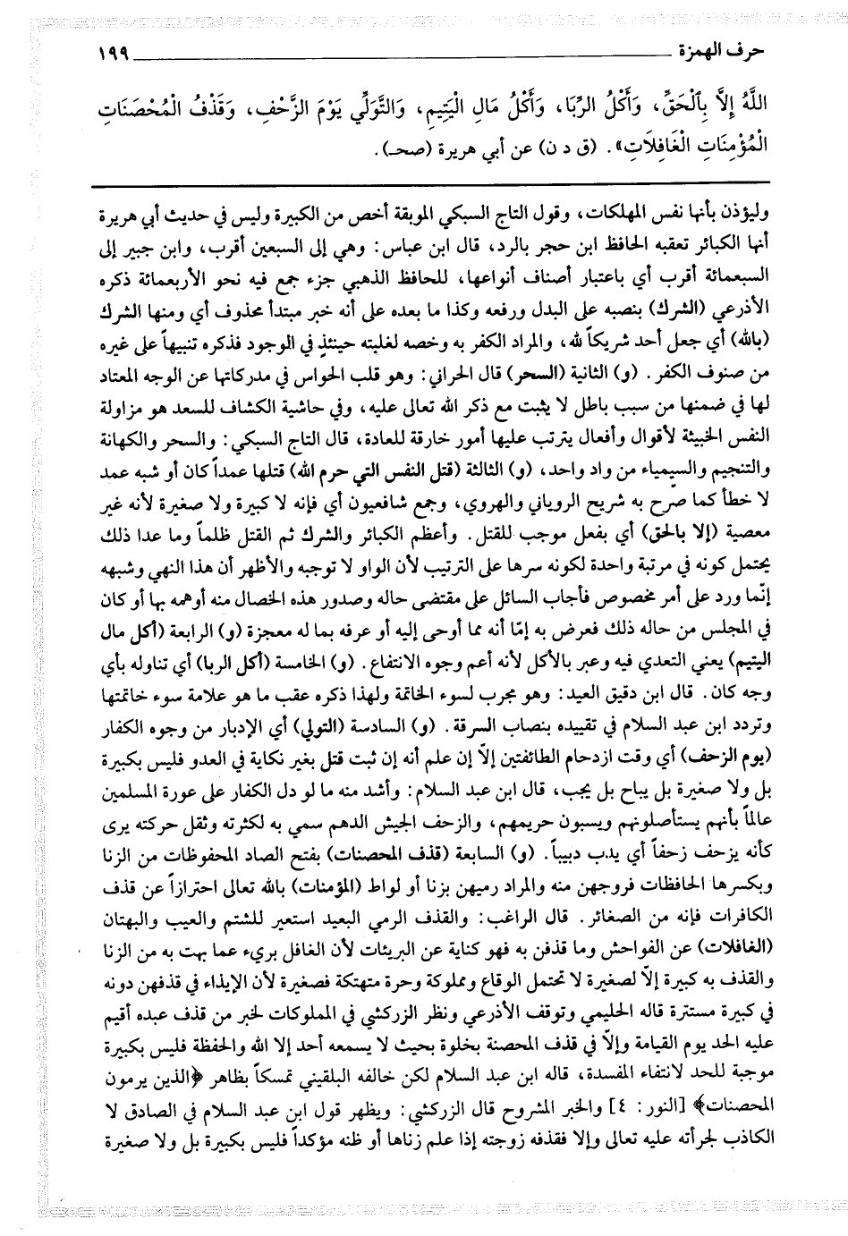 وليؤذن بأنها نفس المهلكات وقول التاج السبكي الموبقة أخص من الكبيرة وليس في حديث أبي هريرة أنها الكبائر تعقبه الحافظ ابن حجر بالرد قال ابن عباس وهي إلى السبعين أقرب وابن جبير إلى السبعمائة أقرب أي باعتبار أصناف أنواعها وللحافظ الذهبي جزء فيه نحو الأربعمائة ذكره الأذرعي (الشرك) بنصبه على البدل ورفعه وكذا ما بعده على أنه خبر مبتدأ محذوف أي ومنها الشرك (بالله) أي جعل أحد شريكا لله والمراد الكفر به وخصه لغلبته حينئذ في الوجود فذكره تنبيها على غيره من صنوف الكفر (و) الثانية (السحر) قال الحراني : وهو قلب الحواس في مدركاتها عن الوجه المعتاد لها في ضمنها من سبب باطل لا يثبت مع ذكر الله تعالى عليه وفي حاشية الكشاف للسعد هو مزاولة النفس الخبيثة لأقوال وأفعال يترتب عليها أمور خارقة للعادة قال التاج السبكي والسحر والكهانة والتنجيم والسيمياء من واد واحد (و) الثالثة (قتل النفس التي حرم الله) قتلها عمدا كان أو شبه عمد لا خطأ كما صرح به شريح الروياني والهروي وجمع شافعيون أي فإنه لا كبيرة ولا صغيرة لأنه غير معصية (إلا بالحق) أي بفعل موجب للقتل وأعظم الكبائر والشرك ثم القتل ظلما وما عدا ذلك يحتمل كونه في مرتبة واحدة لكونه سردها على الترتيب لأن الواو لا توجبه والأظهر أن هذا النهي وشبهه إنما ورد على أمر مخصوص فأجاب السائل على مقتضى حاله وصدور هذه الخصال منه أوهمه بها أو كان