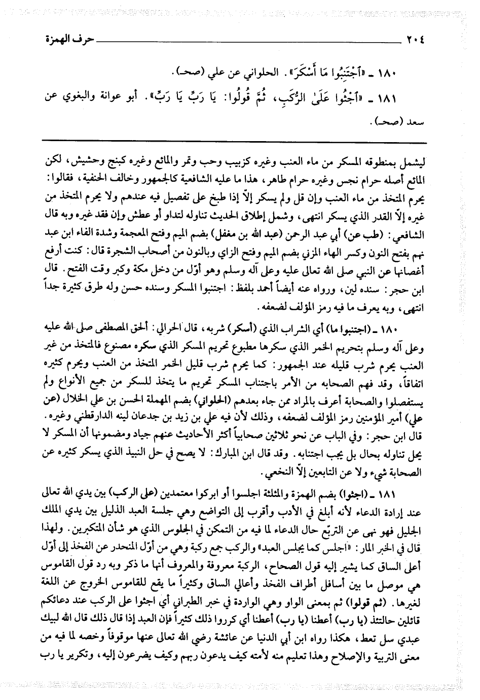 180 - (اجتنبوا ما) أي الشراب الذي (أسكر) شربه قال الحراني : ألحق المصطفى صلى الله عليه وعلى آله وسلم بتحريم الخمر الذي سكرها مطبوع تحريم المسكر الذي سكره مصنوع فالمتخذ من غير العنب يحرم شرب قليله عند الجمهور كما يحرم شرب قليل الخمر المتخذ من العنب ويحرم كثيره اتفاقا وقد فهم الصحب من الأمر باجتناب المسكر تحريم ما يتخذ للسكر من جميع الأنواع ولم يستفصلوا والصحابة أعرف بالمراد ممن جاء بعدهم (الحلواني) بضم المهملة الحسن بن علي الخلال (عن علي) أمير المؤمنين رمز المؤلف لضعفه وذلك لأن فيه علي بن زيد بن جدعان لينه الدارقطني وغيره.